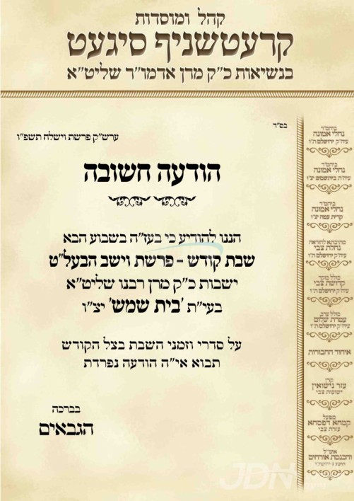 כ"ק אדמו"ר מקרעטשניף סיגעט שליט"א איז צוגאסט אויף דעם שבת אין בית שמש בקרב חסידיו, די תפילות און טישן קומען פאר בבית מדרשו.