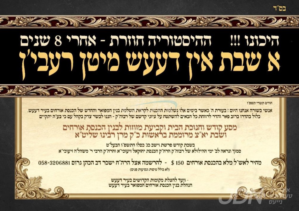 דעם שבת קומט פאר די שמחת הקידושא רבא פון א אייניקל ביי כ"ק אדמו"ר מדעעש שליט"א, א טאכטער פון זיין איידעם הגה"צ ר' שלום מאסקאוויטש שליט"א, זון פון כ"ק אדמו"ר ממעליץ שליט"א פון אשדוד. – די שמחה קומט פאר אין די היסטארישע שוהל אין שטאט דעעש אין ראמעניע.