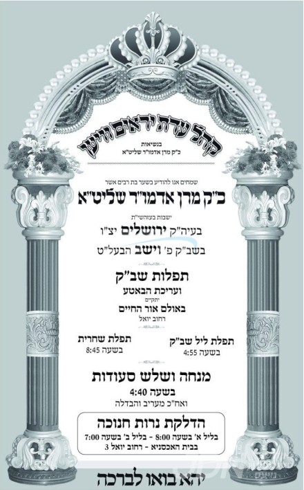 כ"ק אדמו"ר מוויזניץ שליט"א פון ירושלים וועלכער איז צוגאסט די טעג אין ארץ ישראל לכבוד יו"ט חנוכה, וועט פראווענען דעם שבת בבית מדרשו אויף רחוב אדוניהו אין ירושלים.