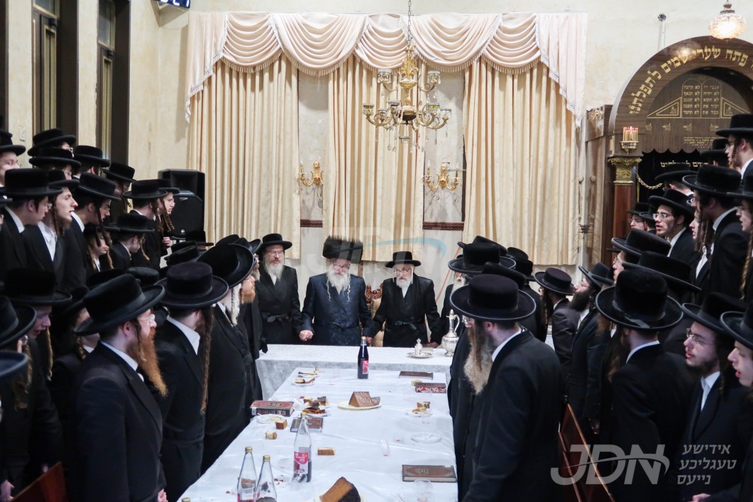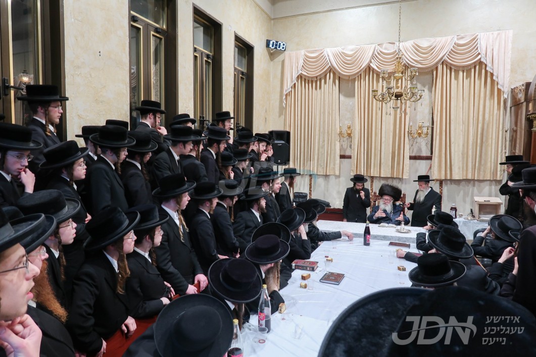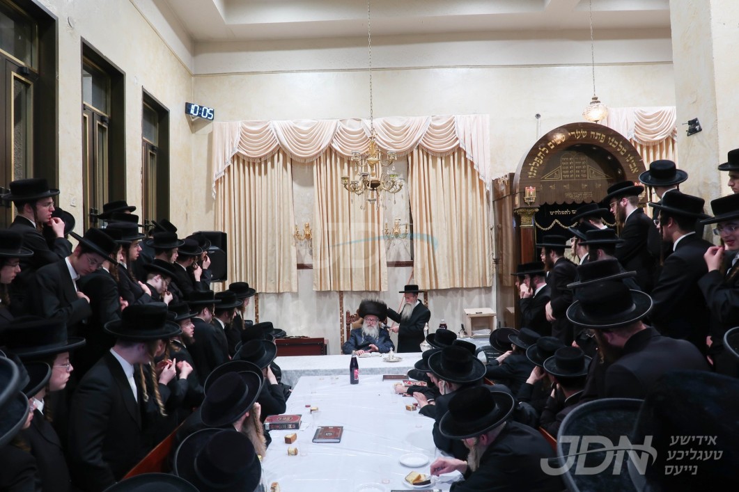 האדמו"ר ממשכנות הרועים ביים לחיים טיש בבית מדרשו לרגל די שמחת החתונה פון אן אייניקל וואס איז פארגעקומען אין ניו יארק