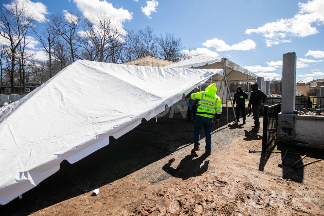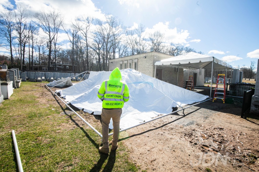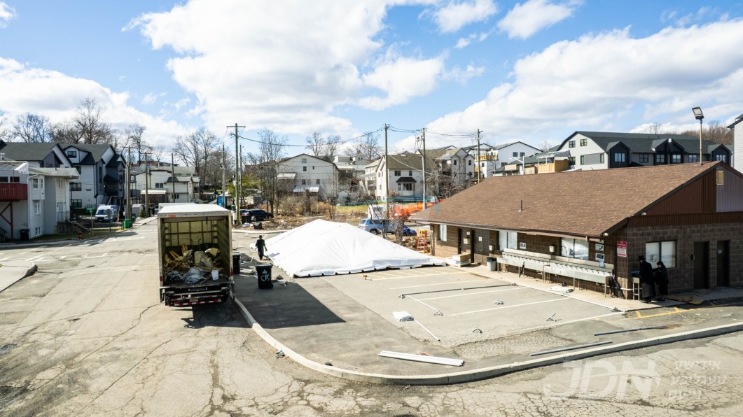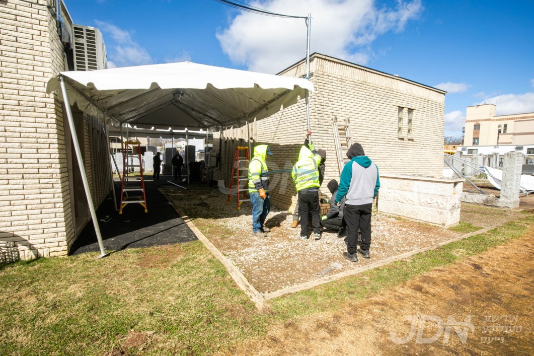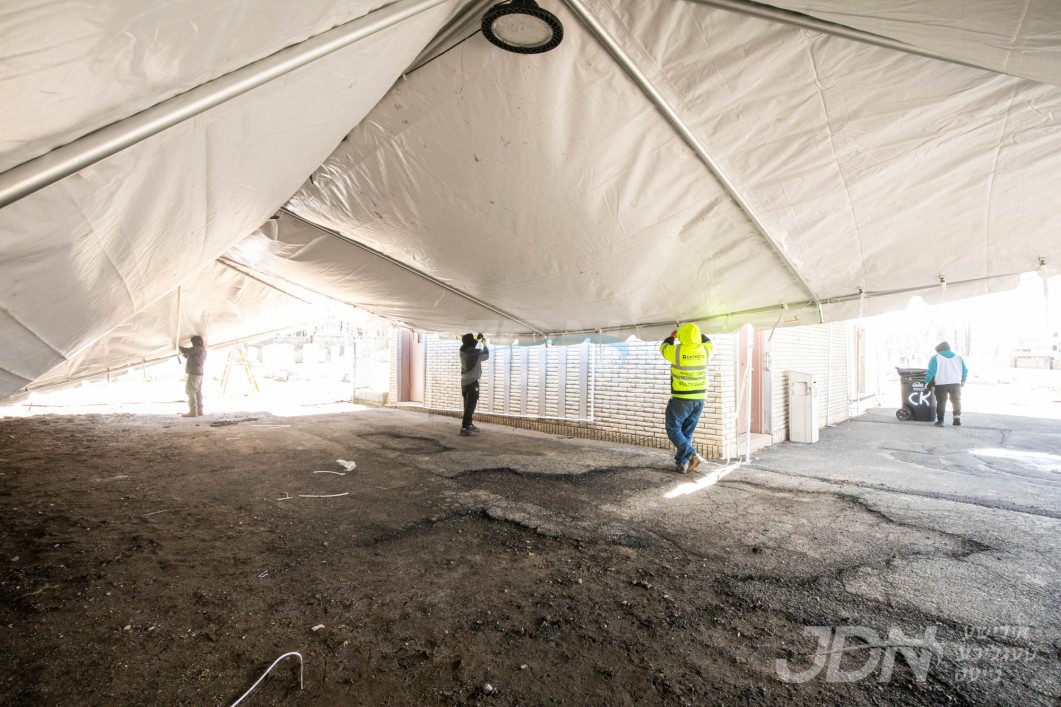 די בארימטע רענטעסטיק פארטי רענטאל פירמע ביים אויפשטעלן א פלאר און טענט ביים באקאנטן ביהמ״ד אין וואודרידזש, צו פארגרינגערן די געדרענג פאר די מתפללי בית המדרש מיט'ן איבערפלוס פון די מנינים