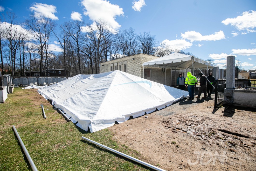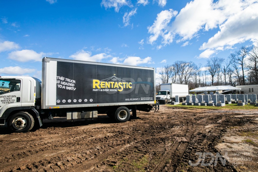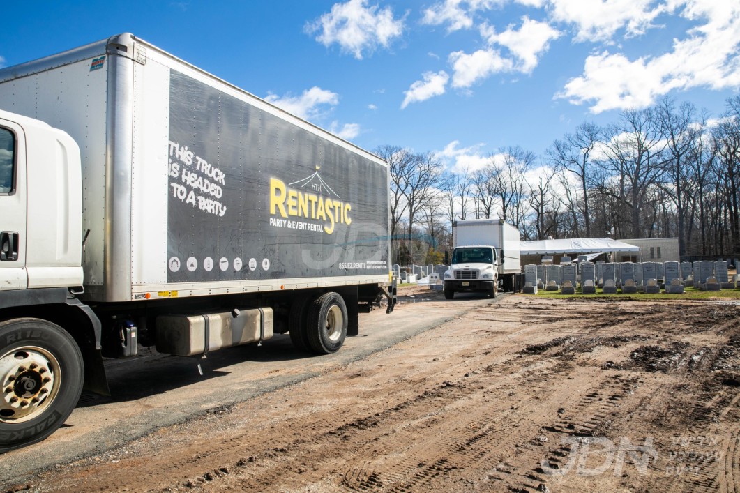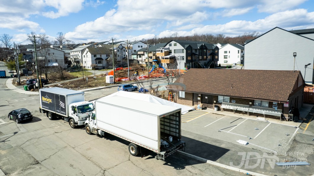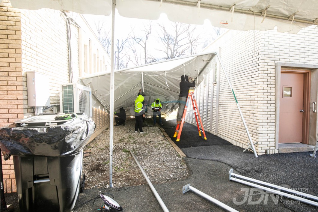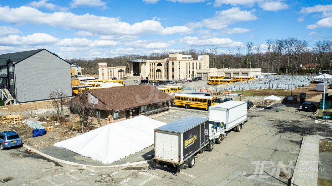 די בארימטע רענטעסטיק פארטי רענטאל פירמע ביים אויפשטעלן א פלאר און טענט ביים באקאנטן ביהמ״ד אין וואודרידזש, צו פארגרינגערן די געדרענג פאר די מתפללי בית המדרש מיט'ן איבערפלוס פון די מנינים