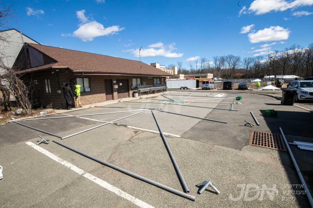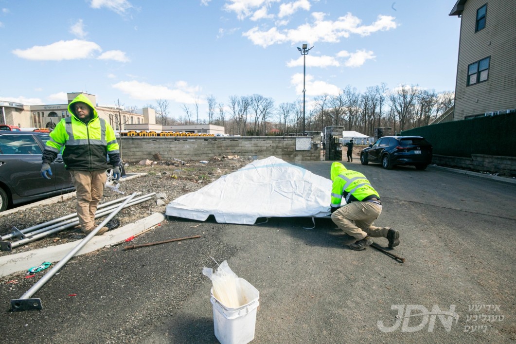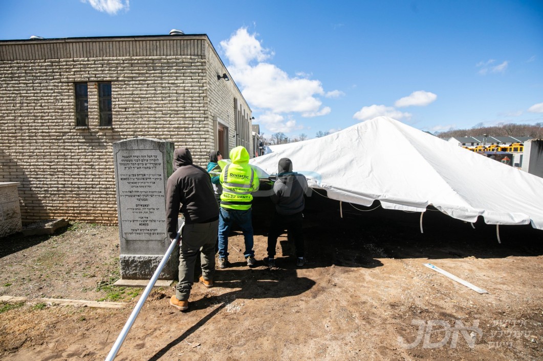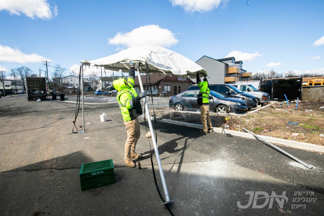 די בארימטע רענטעסטיק פארטי רענטאל פירמע ביים אויפשטעלן א פלאר און טענט ביים באקאנטן ביהמ״ד אין וואודרידזש, צו פארגרינגערן די געדרענג פאר די מתפללי בית המדרש מיט&#039;ן איבערפלוס פון די מנינים