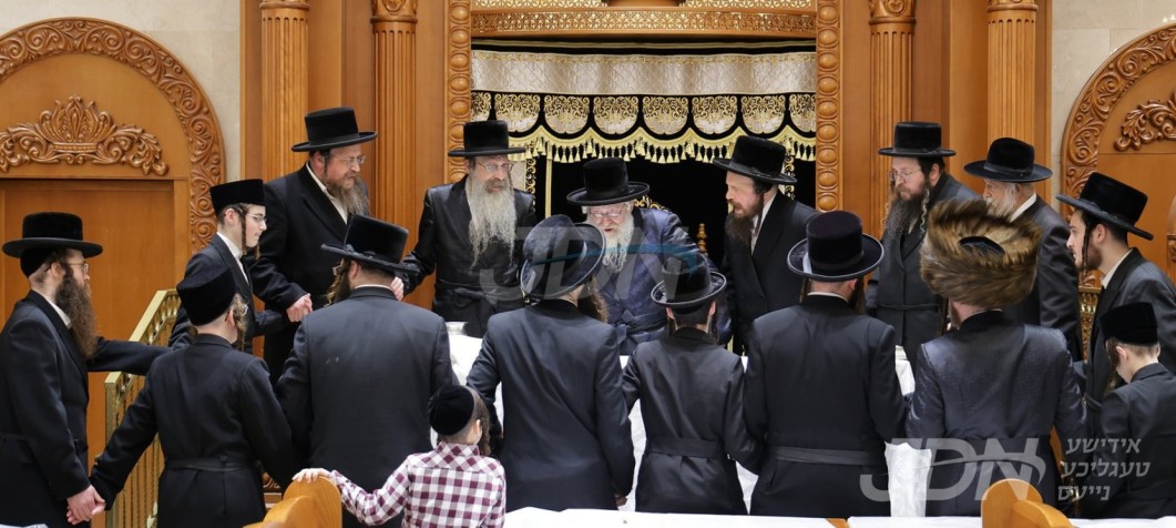 האדמו&quot;ר מוויזניץ פון לאנדאן ביים טיש ליל חמשה עשר בשבט אין מאנסי, אינאיינעם מיט א מסיבה לטובת מוסדות וויזניץ לאנדאן