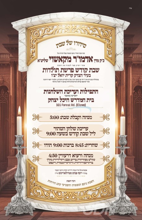די תפילות ברוב עם הדרת מלך, און עריכת השלחנות וועלן געפראוועט ווערן בצוותא חדא, אינעם רחבות'דיגן לאקאל, היכל בית המדרש 'היכל יצחק' אויף 101 פארעסט רד. (אינעם בנין פון קלאוו) אין צענטער פון שטאט. ווען דער ציבור הגדול אין שפיץ פון תלמידים יקרים און פילע געסט וואס וועלן קומען זיך באטייליגן ביים היסטארישן שבת, וועלן דאווענען אינאיינעם בהתלהבות והשתפכות הנפש, לכבוד יום השבת.