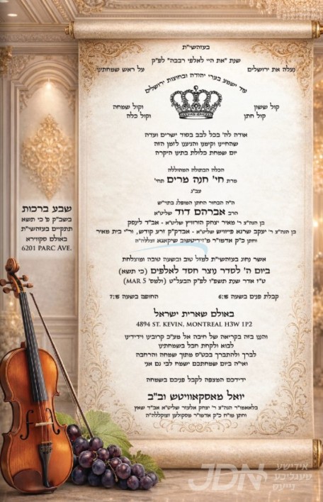 היינט קומט פאר די שמחת החתונה פונעם חתן א זון פון הגה"צ ר' מאיר יצחק הורוויץ שליט"א אבד"ק לינסק, זון פון הגה"צ ר' יעקב שרגא הורוויץ שליט"א אבד"ק זרע קודש וראש ישיבת בית מאיר, און איידעם ביי כ"ק אדמו"ר מזידטשויב שיקאגא זצ"ל, מיט די כלה א טאכטער ביי הגה"צ ר' יואל מאסקאוויטש שליט"א אבד"ק מאור הגולה מאנטריאל, זון פון הגה"צ ר' יצחק אלעזר מאסקאוויטש שליט"א משאץ, און איידעם ביי כ"ק אדמו"ר מסקולען זצ"ל בעל ישועת יעקב. – די שמחת החתונה קומט פאר אין זאל שארית ישראל אין מאנטריאל.