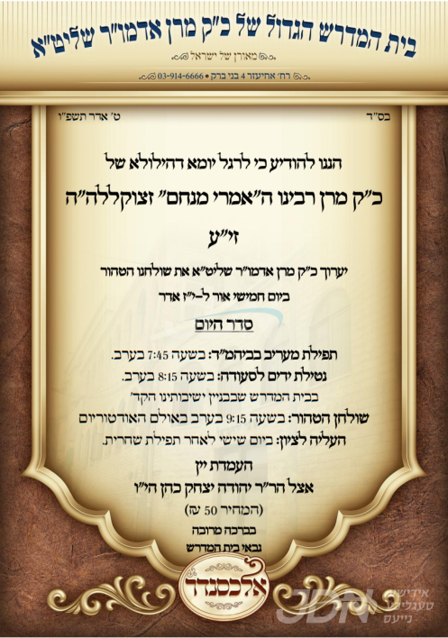 היינט נאכט י"ז אדר געפאלט די יומא דהילולא קדישא פון כ"ק אדמו"ר מאלכסנדר זצ"ל בעל אמרי מנחם, בנו ממלא מקומו כ"ק אדמו"ר מאלכסנדר שליט"א וועט אפרעכטן די יארצייט טיש אינעם גרויסן אודיטוריום אין בני ברק, און מארגן פרייטאג אינדערפרי פוקד זיין דעם ציון הק' אויפן בית החיים זכרון מאיר אין בני ברק.