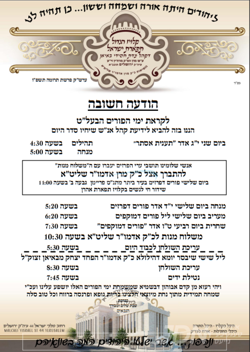היינט ט"ז אדר געפאלט די יומא דהילולא קדישא פון הרה"ק בעל פני מנחם מגור זצ"ל, פילע אידן וועלן פוקד זיין דעם ציון הק' אין חצר פון ישיבת שפת אמת אין ירושלים. אין בארא פארק קומט פאר א גרויסע יארצייט סעודה אין זאל פון זמר, אין שפיץ פון נכדו הגדול פונעם בעל ההילולא הגה"צ ר' אברהם מרדכי אלתר שליט"א.