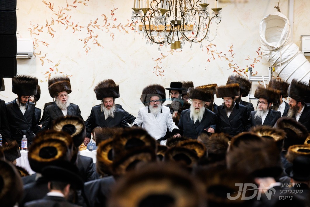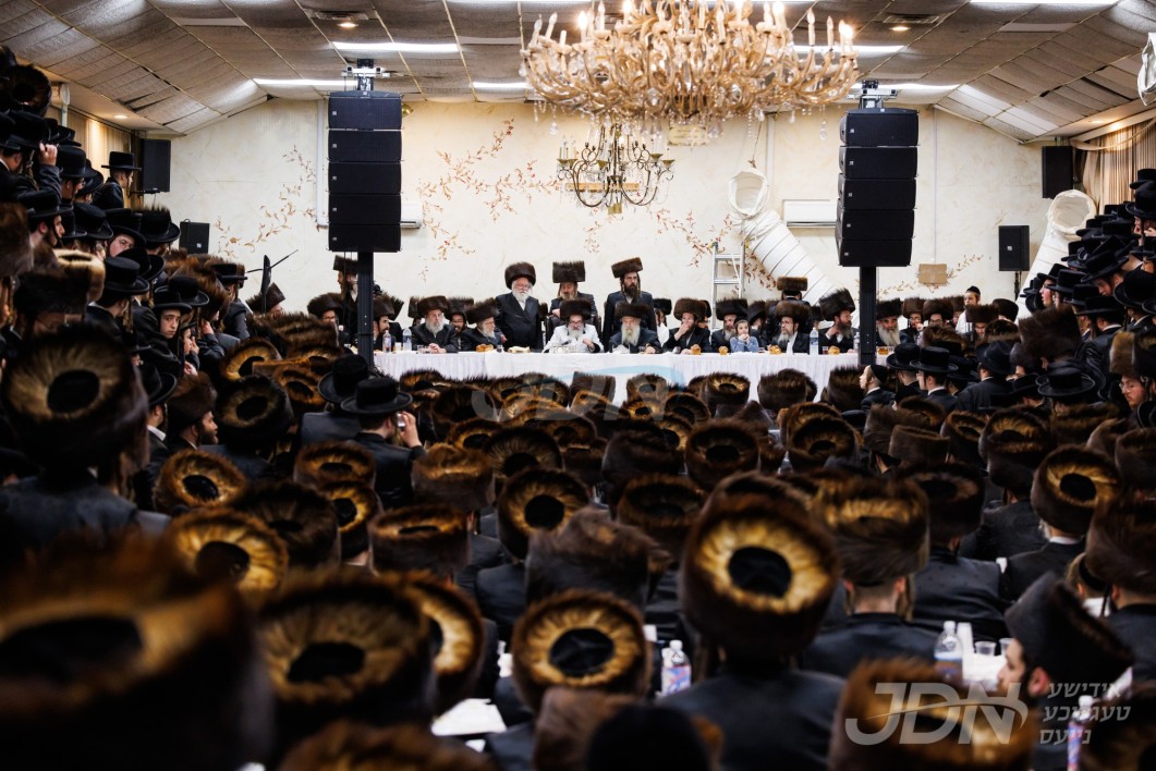 האדמו&quot;ר מסקולען פון וויליאמסבורג ביים סעודת הודאה מוצאי שבת נחמו אין קרית יטב לב בלומינגבורג