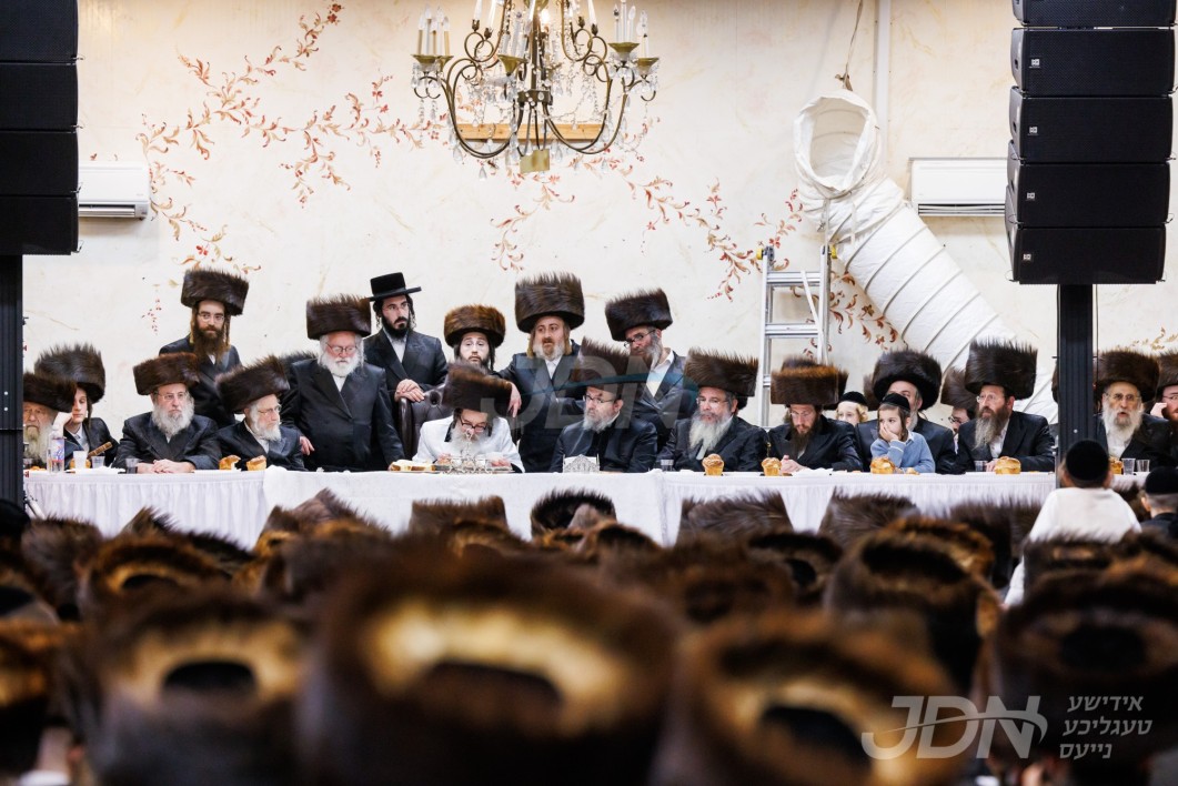 האדמו"ר מסקולען פון וויליאמסבורג ביים סעודת הודאה מוצאי שבת נחמו אין קרית יטב לב בלומינגבורג