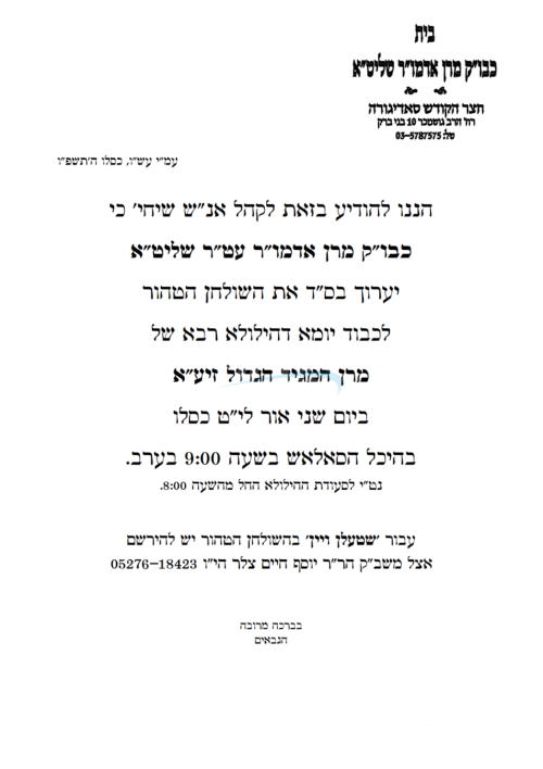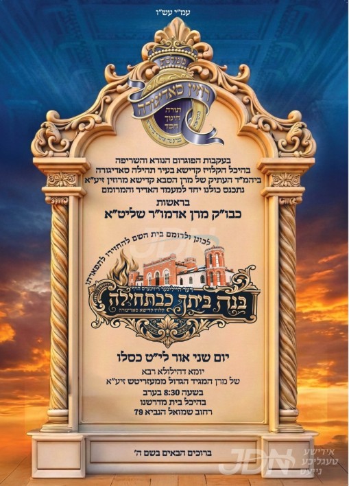 כ"ק אדמו"ר מסאדיגורא ירושלים שליט"א וועט אפרעכטן דעם יארצייט טיש, אינאיינעם מיטן מעמד "בנה ביתך כבתחילה" שטייענדיג נאך די שרעקליכע פייער וואס האט אנגעברענגט שווערע שאדן אינעם הייליגן קלויז אין שטאט סאדיגורא אין אוקראינע.