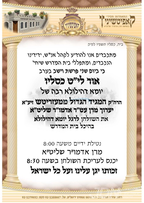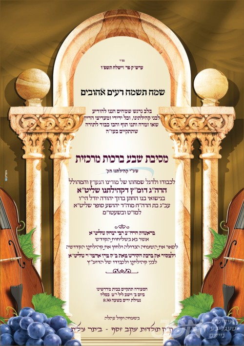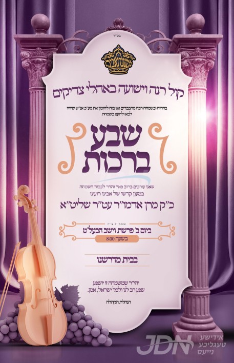 היינט קומט פאר די שמחת השבע ברכות אין ביהמ"ד סקווירא אין ביתר, לכבודו פונעם דיין הקהילה הרה"ג ר' יעקב יוסף פאל שליט"א, אין שפיץ פון הגה"צ ר' יצחק טווערסקי שליט"א בן כ"ק אדמו"ר מסקווירא שליט"א, וועלכער איז ספעציעל געפארן קיין ארץ ישראל לכבוד די שמחה.