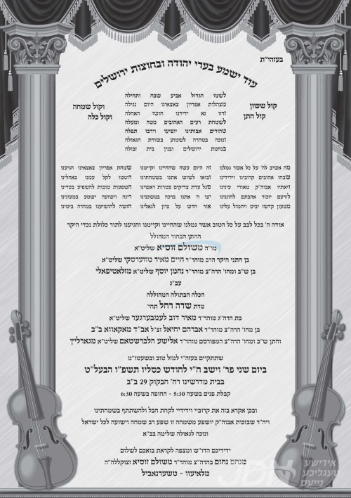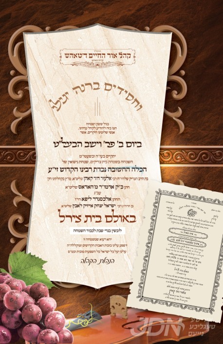 היינט קומט פאר די שמחת החתונה פונעם חתן א זון פון הגה"צ ר' ישראל לאבין שליט"א מזידטשויב מאנסי, איידעם ביי הגה"צ ר' יקותיאל משה שמחה שליט"א, מיט די כלה א טאכטער פון הגה"צ ר' אלעזר דוד קאהן שליט"א, זון פון הגה"צ אבד"ק סענדזשארץ שליט"א, און איידעם ביי כ"ק אדמו"ר מהאדאס שליט"א. – די שמחת החתונה קומט אין זאל בית צירל אין קרית טאהש.