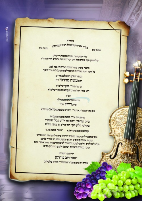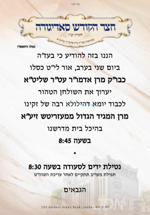 היינט קומט פאר די שמחת החתונה פונעם חתן א זון פון הגה"צ ר' יעקב נחמי' פאדווא שליט"א, זון פון הגה"צ גאב"ד לאנדאן שליט"א בעל מנחת אפרים, מיט די כלה א טאכטער פון הגה"צ ר' אליקים געציל ווייס שליט"א ראה"כ מאחנובקא בעלזא לאנדאן, זון פון הגה"צ ר' לייבל ווייס שליט"א, און איידעם ביי הגה"צ אב"ד קיוויאשד מאנסי זצ"ל, אור אייניקל פון הנגיד החסיד ר' אליש ענגלענדער שליט"א. – די שמחת החתונה קומט פאר אין זאל קערווען סוט אין לאנדאן.