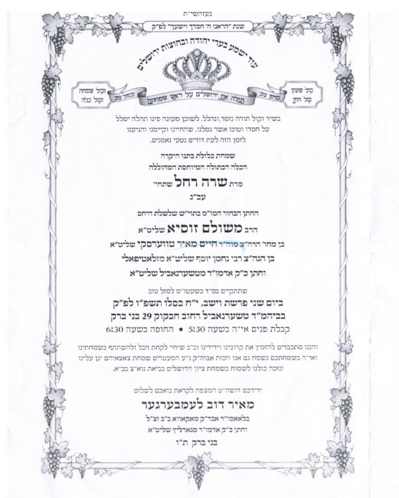 היינט קומט פאר די שמחת החתונה פון חתן כלה אייניקלעך ביי הגה"צ אבד"ק ציעשנוב שליט"א, אור אייניקלעך פון כ"ק אדמו"ר מסטריזוב שליט"א, די חתן א זון פון הגה"צ ר' שלמה רובין שליט"א אבד"ק ציעשנוב קרית יואל, איידעם ביי הגה"צ גאב"ד סאטמאר מאנטריאל שליט"א, מיט די כלה א טאכטער פון הגה"צ ר' יעקב ישראל ישורון רובין שליט"א, זון פון הגה"צ אבד"ק גלאגוב זצ"ל, און איידעם ביי הגה"צ אבד"ק ציעשנוב שליט"א. – די שמחת החתונה קומט פאר אין זאל עטרת גאלדא אין בארא פארק.