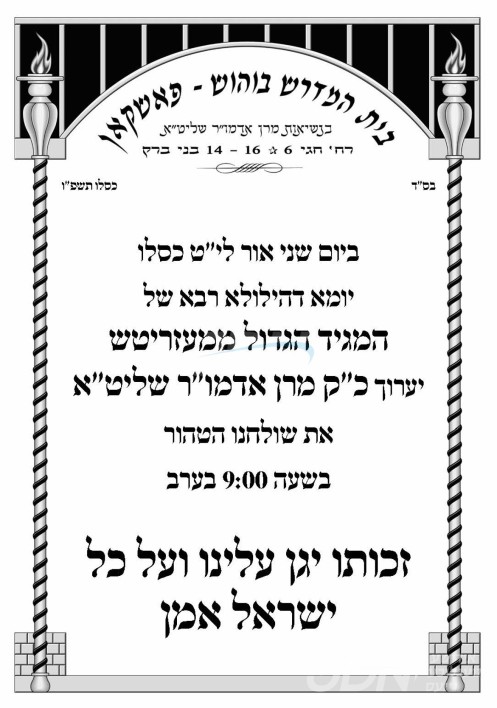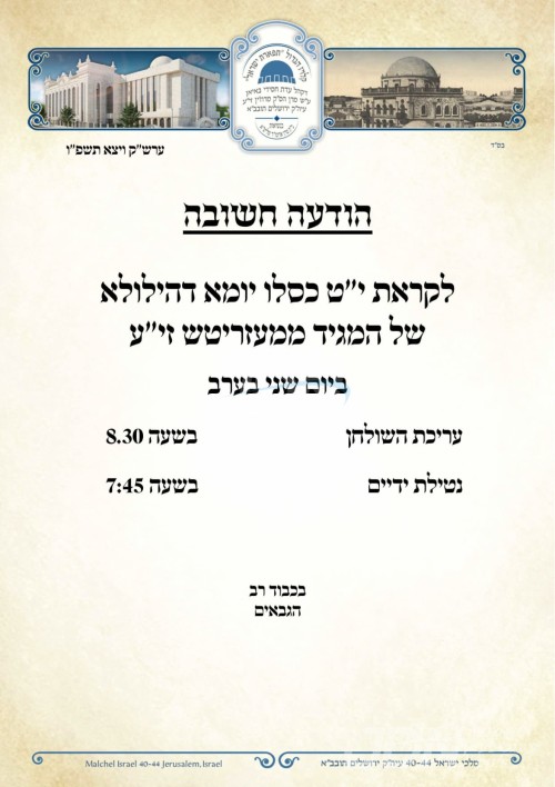 היינט נאכט י"ט כסלו געפאלט די יומא דהילולא קדישא פונעם גרויסן מגיד הרה"ק ממעזריטש זי"ע, איבער די גאנצע וועלט וועט פארקומען יארצייט סעודות לזכרו הטהור, די אייניקלעך כ"ק האדמורי"ם לבית רוזין, באיאן, בוהוש, סאדיגורא, און קאפיטשניץ שליט"א, וועלן אפרעכטן די יארצייט טישן אין די בתי מדרשים.