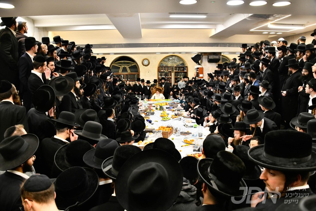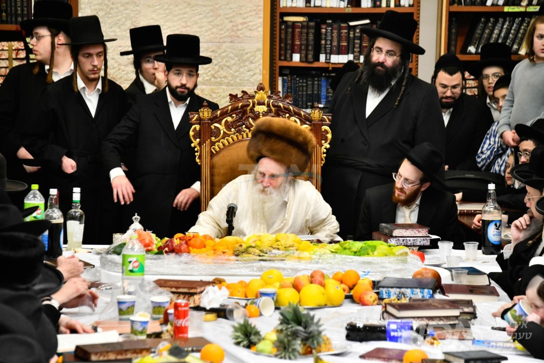 האדמו"ר מוויזניץ ביים טיש חמשה עשר בשבט מיט האחים האדמורי"ם מוויזניץ קייאמישע און וויזניץ בית שמש, אינאיינעם מיטן שמחת השבע ברכות בחצר הקודש וויזניץ