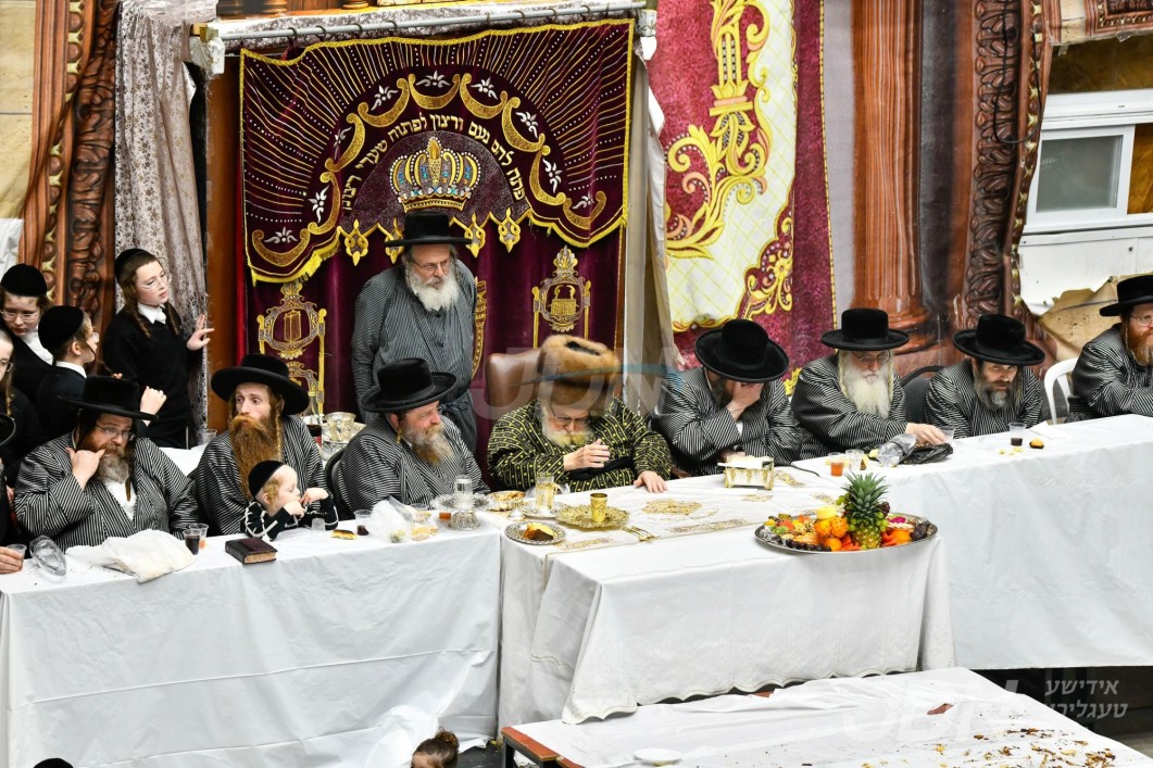 האדמו"ר מוויזניץ ביים טיש חמשה עשר בשבט מיט האחים האדמורי"ם מוויזניץ קייאמישע און וויזניץ בית שמש, אינאיינעם מיטן שמחת השבע ברכות בחצר הקודש וויזניץ
