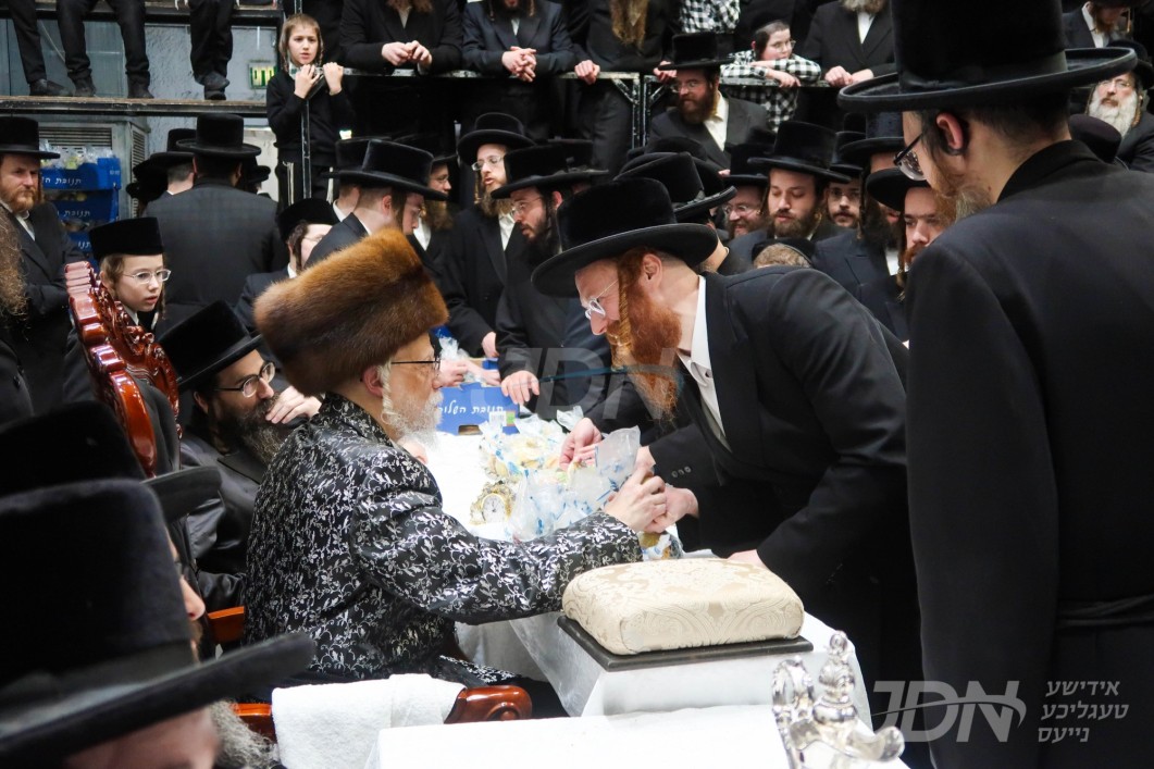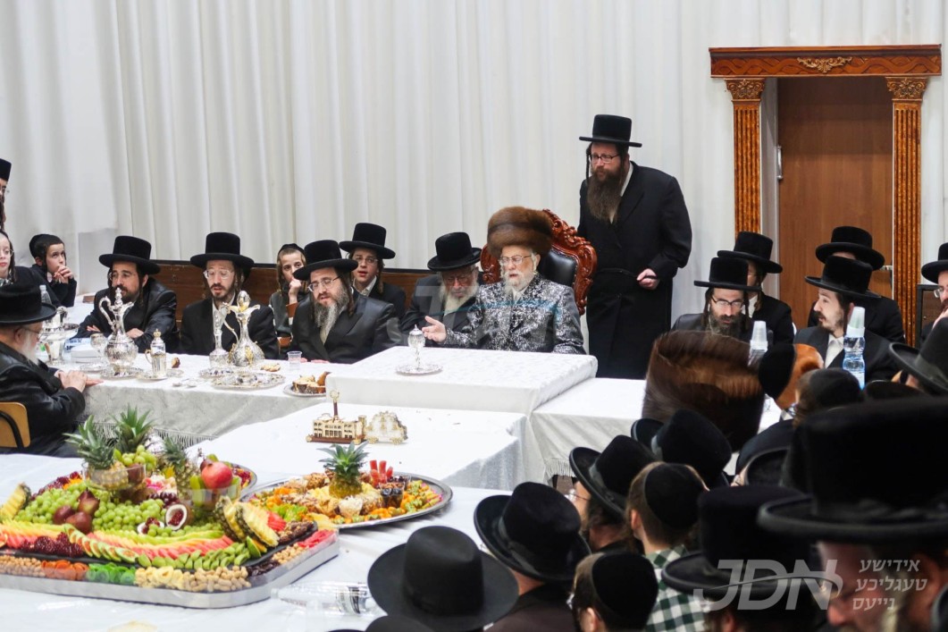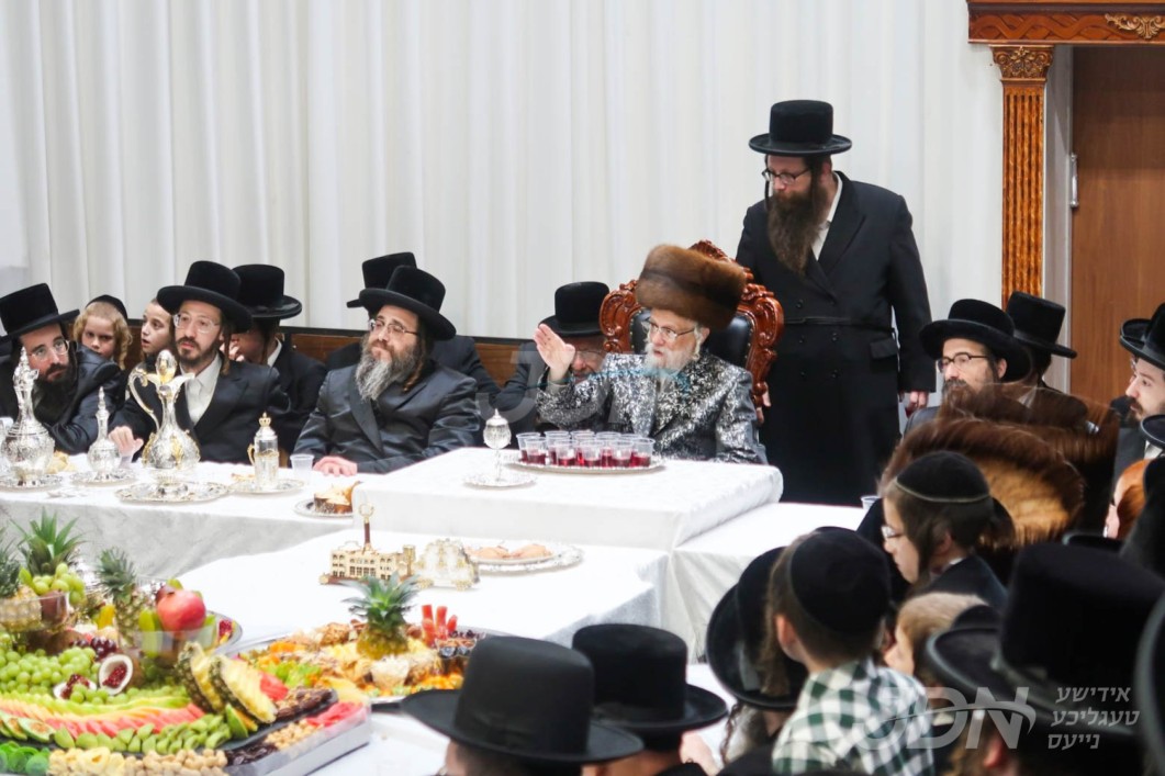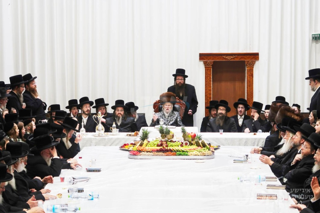 האדמו"ר מוויזניץ ביים טיש חמשה עשר בשבט מיט האחים האדמורי"ם מוויזניץ קייאמישע און וויזניץ בית שמש, אינאיינעם מיטן שמחת השבע ברכות בחצר הקודש וויזניץ