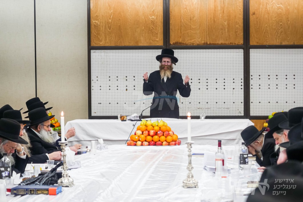 האדמו"ר מוויזניץ ביים טיש חמשה עשר בשבט מיט האחים האדמורי"ם מוויזניץ קייאמישע און וויזניץ בית שמש, אינאיינעם מיטן שמחת השבע ברכות בחצר הקודש וויזניץ
