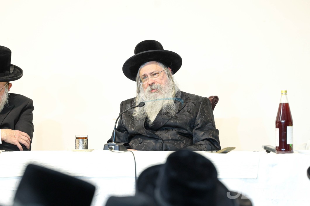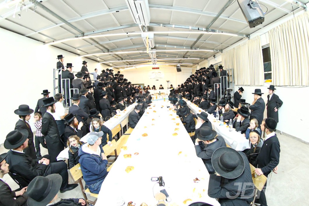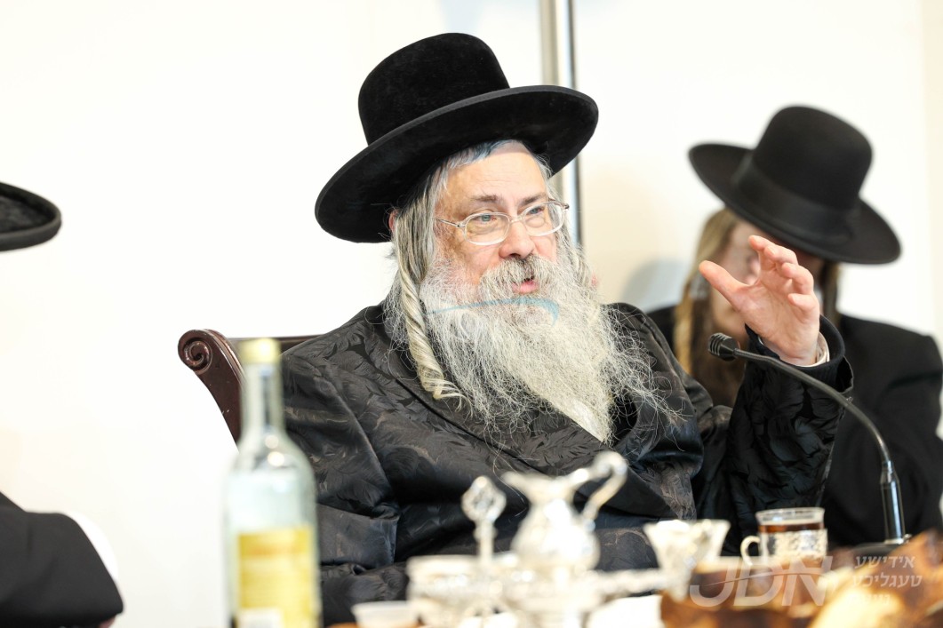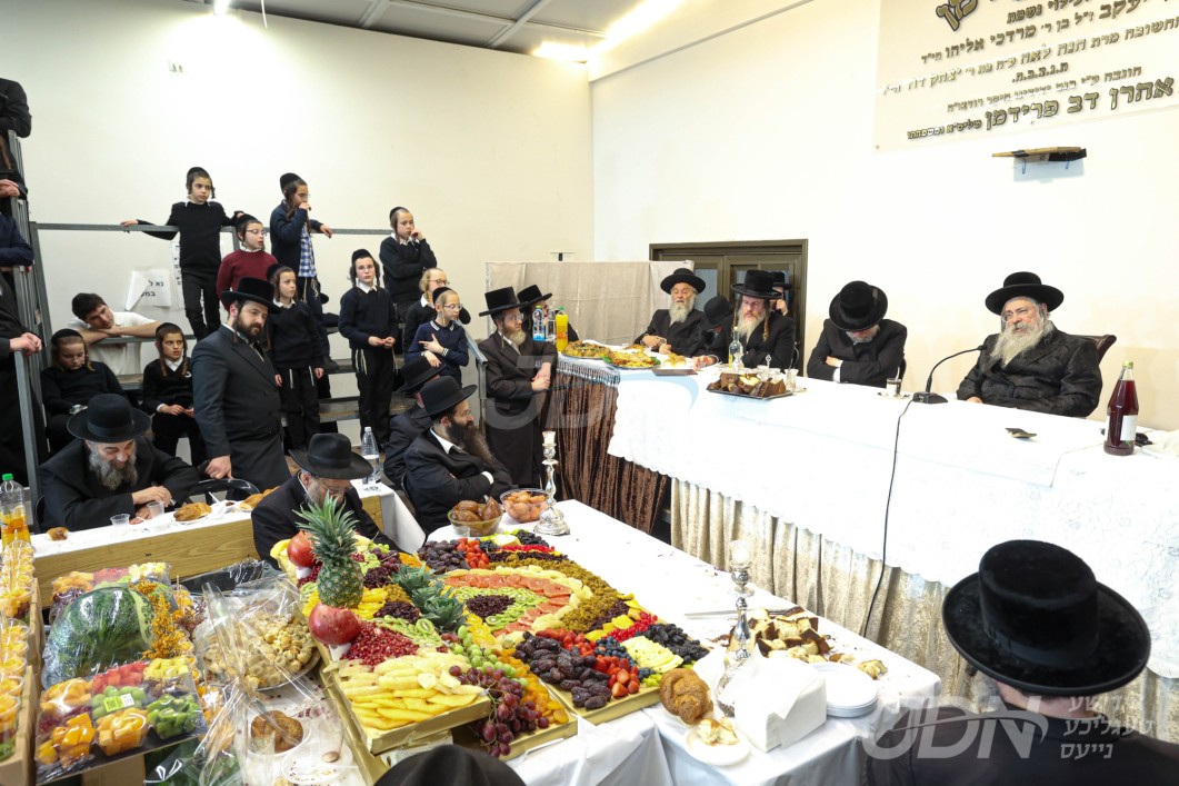 האדמו"ר מוויזניץ ביים טיש חמשה עשר בשבט מיט האחים האדמורי"ם מוויזניץ קייאמישע און וויזניץ בית שמש, אינאיינעם מיטן שמחת השבע ברכות בחצר הקודש וויזניץ