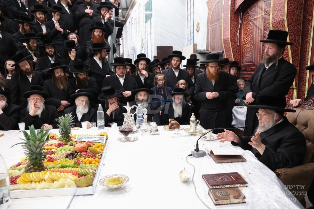האדמו"ר מוויזניץ ביים טיש חמשה עשר בשבט מיט האחים האדמורי"ם מוויזניץ קייאמישע און וויזניץ בית שמש, אינאיינעם מיטן שמחת השבע ברכות בחצר הקודש וויזניץ