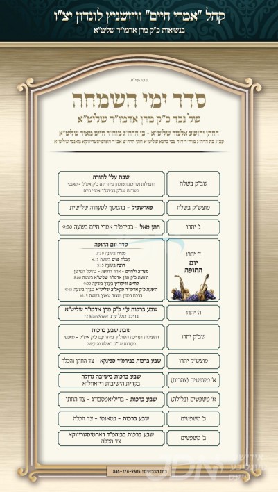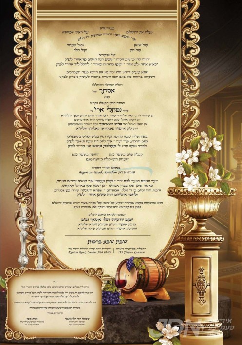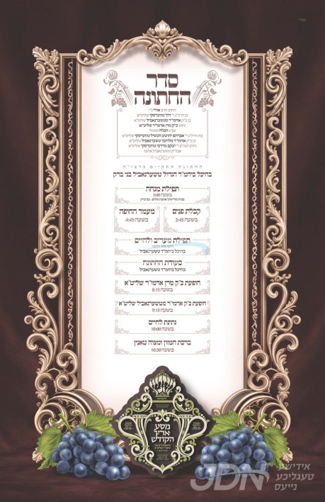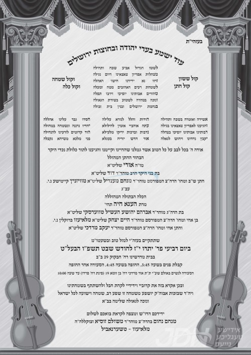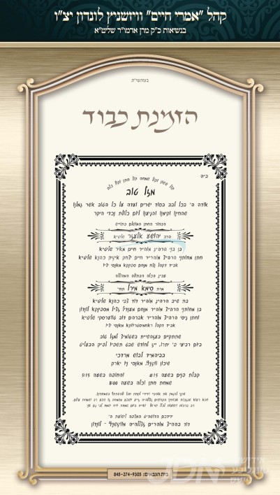 היינט קומט פאר די שמחת החתונה פונעם חתן א זון פון הרב מרדכי גינזבערג שליט"א, זון פון הגה"צ ר' אלעזר יונה גינזבערג זצ"ל רב דקהל אגודת אחים, און איידעם ביי הגה"צ ר' אשר אנשיל יונגרייז זצ"ל אבד"ק תפארת עמרם לאנדאן, איידעם ביי כ"ק אדמו"ר מליעזש זצ"ל, מיט די כלה א טאכטער פון הרב מרדכי פעלדמאן שליט"א, זון פון הרב שלום זושא פעלדמאן שליט"א פון לאנדאן, און איידעם ביי הגה"צ אבד"ק רודניק לאס אנדזשעלעס שליט"א. – די שמחת החתונה קומט פאר אין די דעקאריום זאל אין לאנדאן.