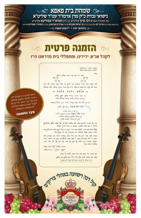 היינט קומט פאר די שמחת החתונה פונעם חתן א זון פון הגה"צ ר' אפרים דוב כהנא שליט"א, זון פון כ"ק אדמו"ר מספינקא ירושלים זצ"ל, און איידעם ביי כ"ק אדמו"ר מהאלמין שליט"א, מיט די כלה א טאכטער פון הגה"צ ר' יחיאל מאיר פאנעט שליט"א רב ביהמ"ד בעלזא אין בני ברק, איידעם ביי כ"ק אדמו"ר מגארליץ זצ"ל. – די שמחת החתונה קומט פאר אין זאל רויאל אין בני ברק.