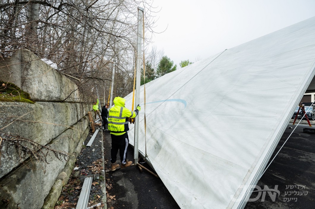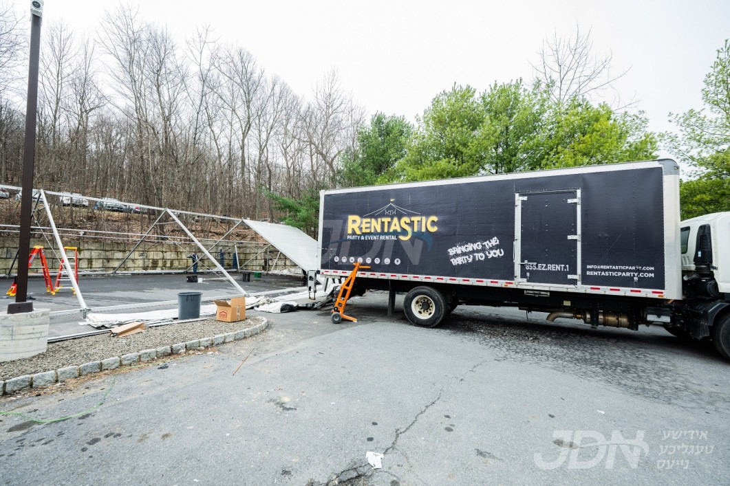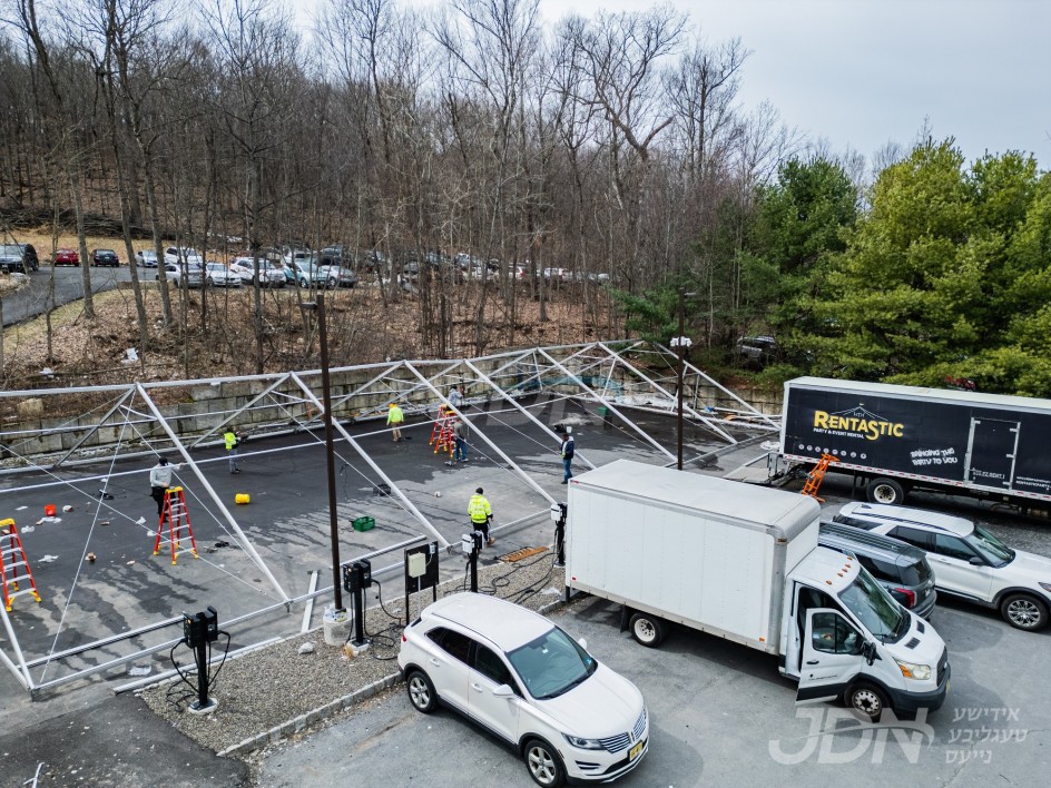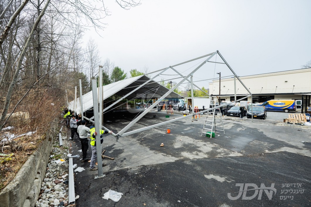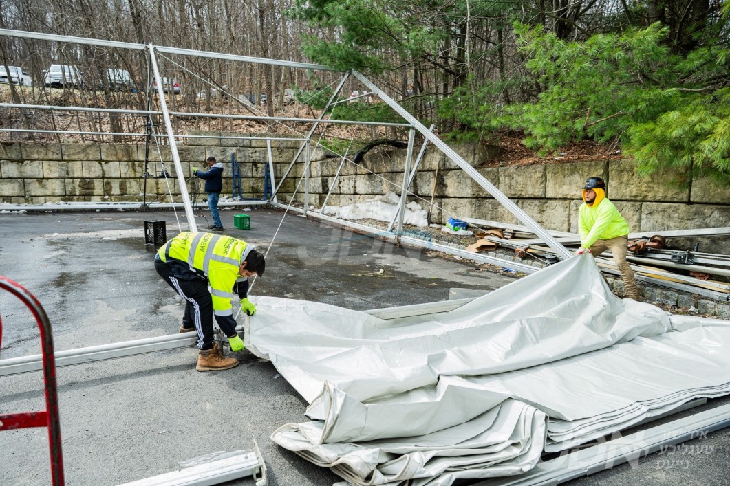 די בארימטע רענטעסטיק פארטי רענטאל פירמע ביים אויפשטעלן א ריזן שאטער אין די פארקינג לאט פון שלומיס סופערמארקעט אין קרית יואל
