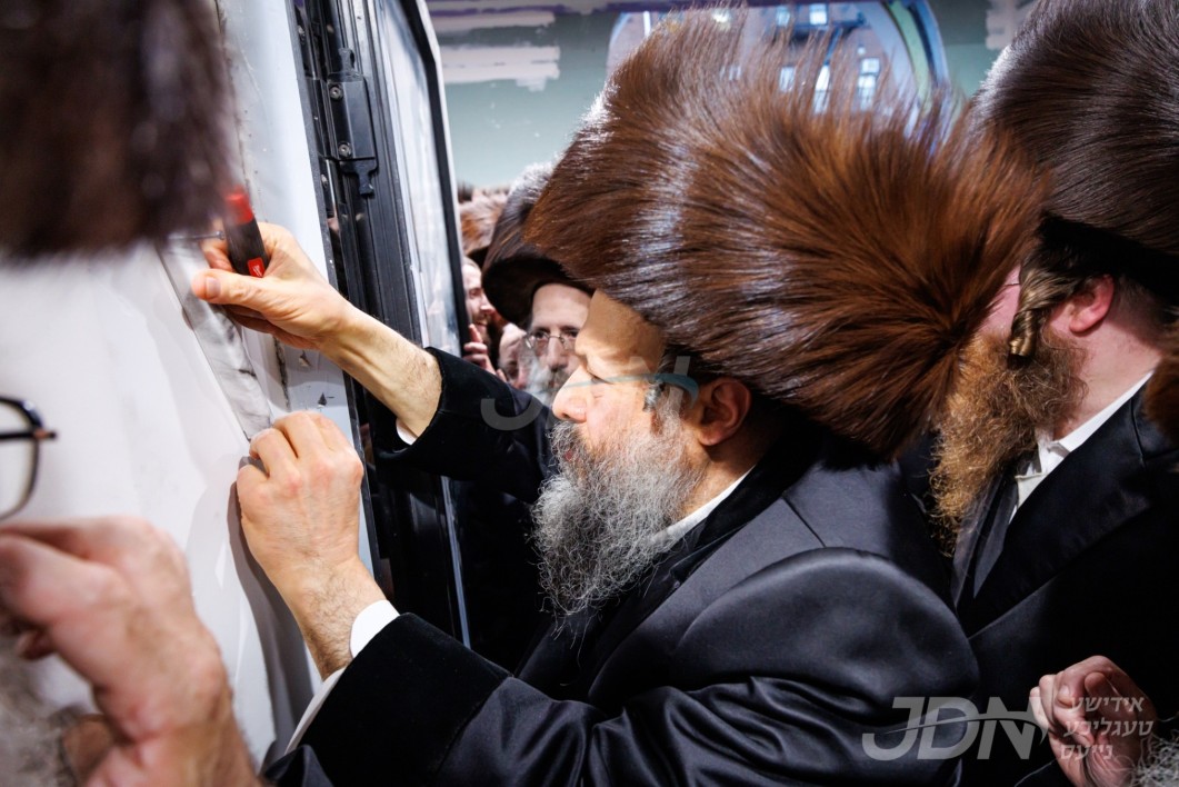מעמד קביעת מזוזה פון ביהמ"ד החדש באבוב-45 און ראש השנה אין חצר הקודש באבוב-45