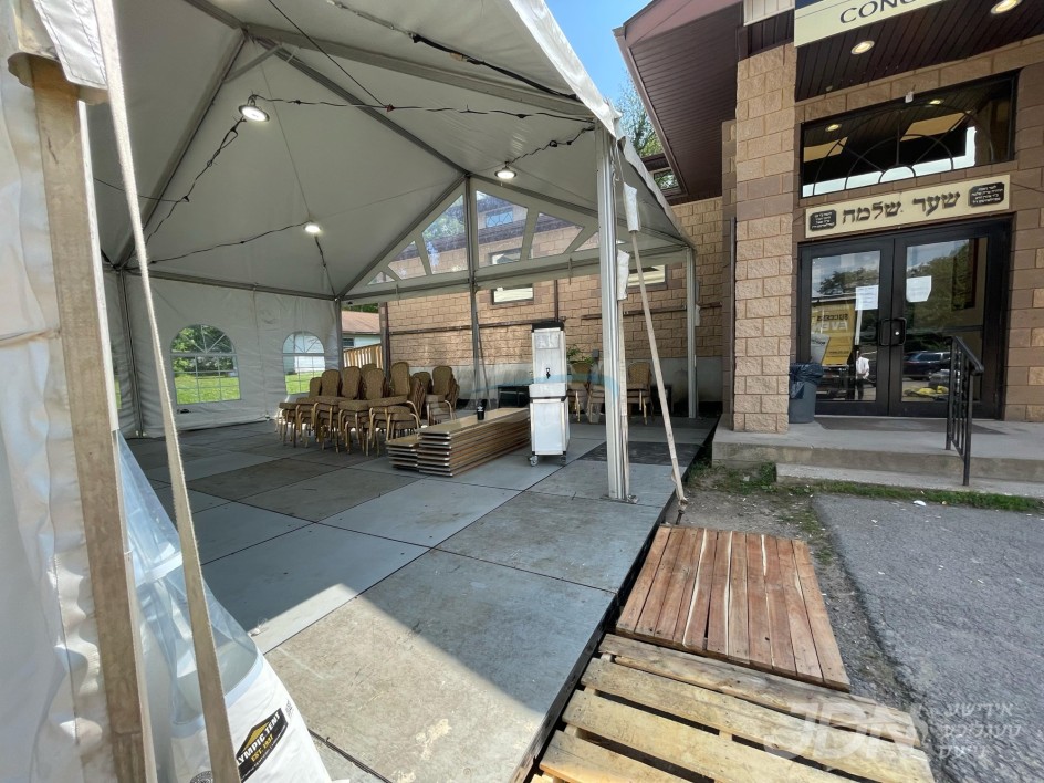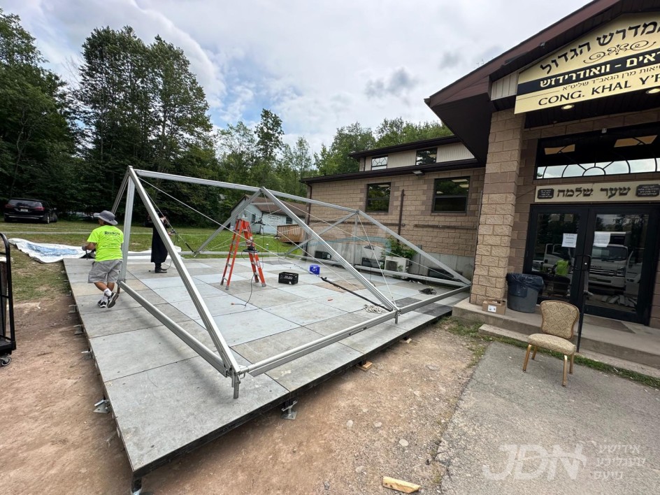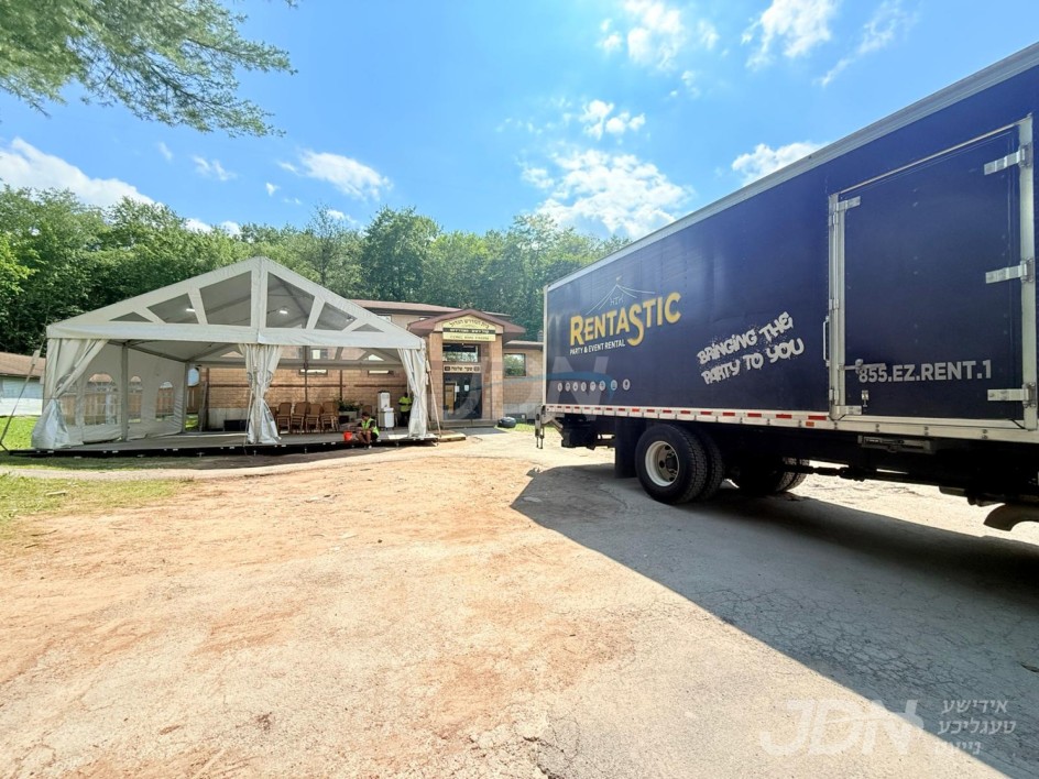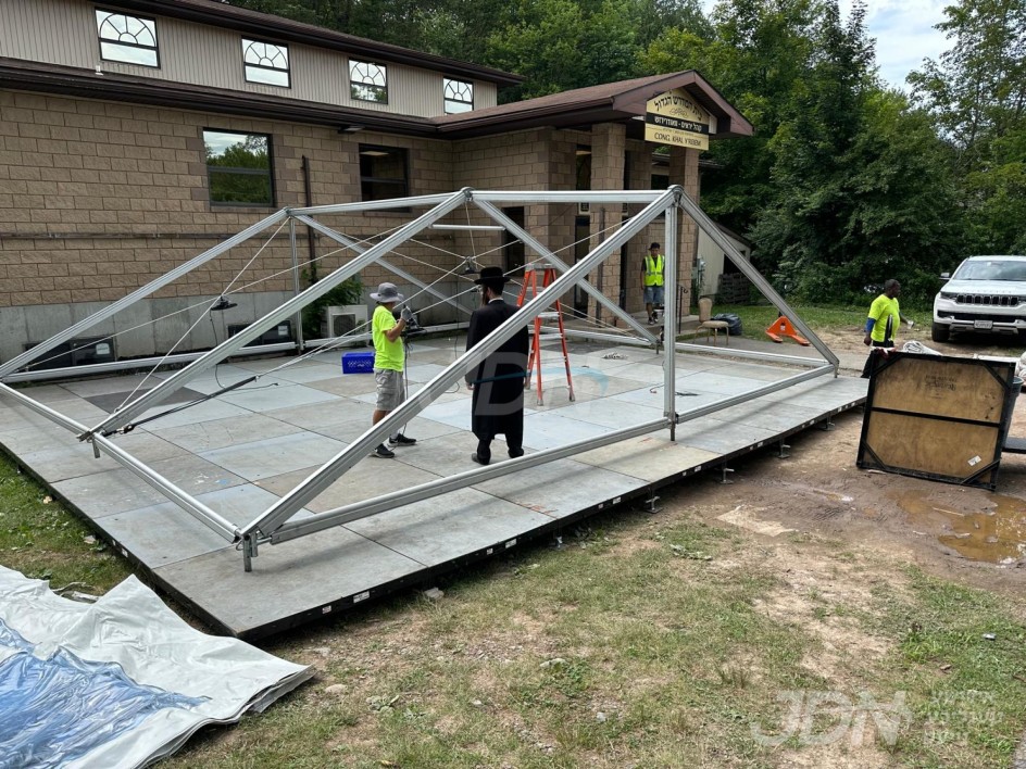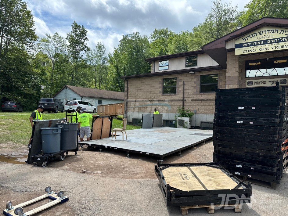 די בארימטע רענטעסטיק פארטי רענטאל פירמע ביים אויפשטעלן א פלאר און טענט ביים באקאנטן ביהמ״ד אין וואודרידזש, צו פארגרינגערן די געדרענג פאר די מתפללי בית המדרש מיט'ן איבערפלוס פון די מנינים