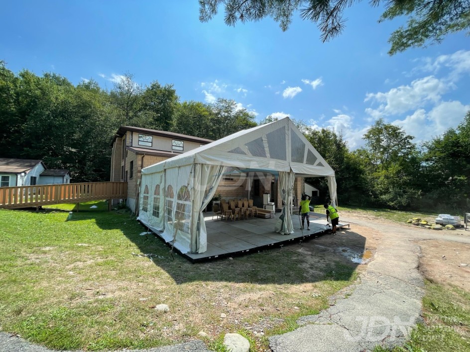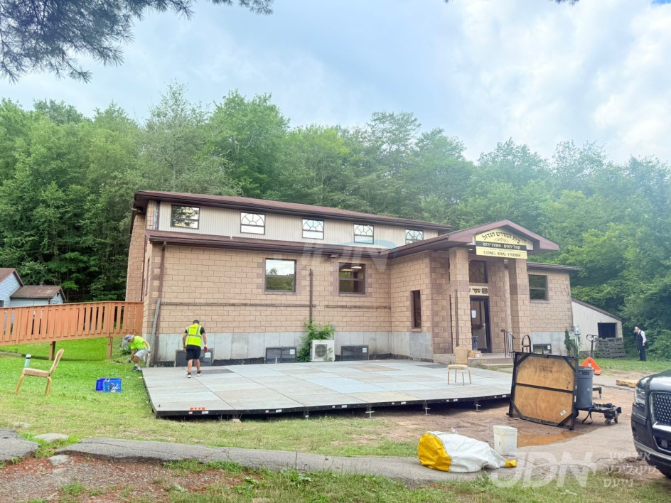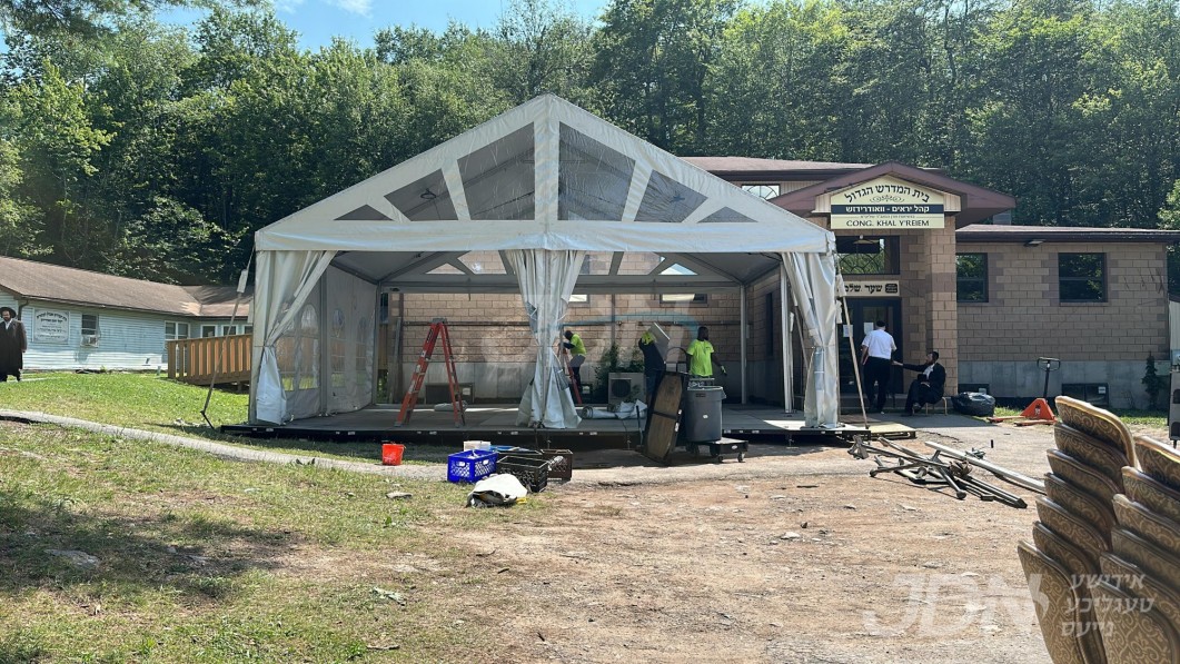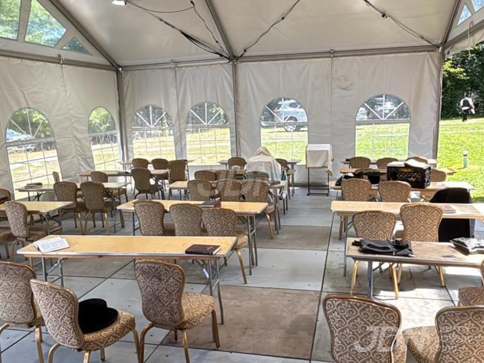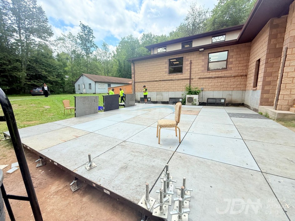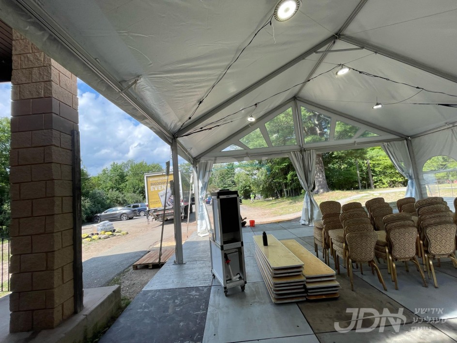 די בארימטע רענטעסטיק פארטי רענטאל פירמע ביים אויפשטעלן א פלאר און טענט ביים באקאנטן ביהמ״ד אין וואודרידזש, צו פארגרינגערן די געדרענג פאר די מתפללי בית המדרש מיט'ן איבערפלוס פון די מנינים