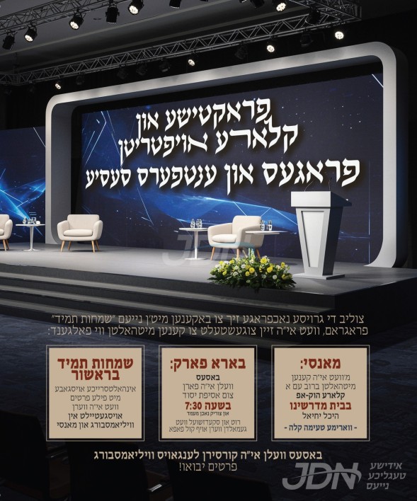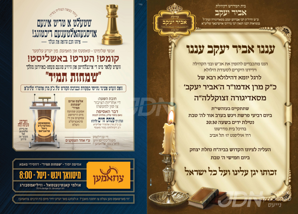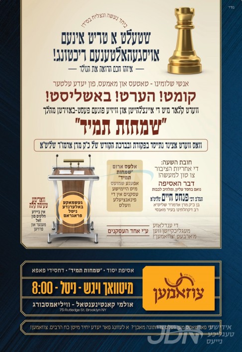 היינט נאכט קומט פאר א מעמד "שמחות תמיד" פאר כלל חסידי פאפא, פארצושטעלן פאר די חברי הקהילה פרישע הילף פלענער ביים חתונה מאכן בשעה טובה ומוצלחת, עס קומט פאר אין קאנטינענטאל זאל אין וויליאמסבורג, וואו הגה"צ ר' פנחס חיים גרינוואלד שליט"א אבד"ק פאפא מאנסי בן כ"ק אדמו"ר מפאפא שליט"א, וועט אויפטרעטן מיטן דבר האסיפה.