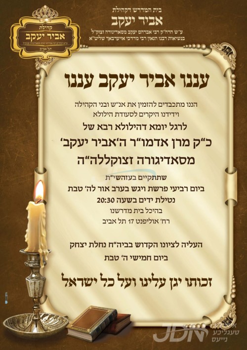 היינט נאכט ה' טבת געפאלט די יומא דהילולא קדישא פון הרה"ק בעל אביר יעקב מסאדיגורא זי"ע, א יארצייט סעודה קומט פאר אין ביהמ"ד אביר יעקב אין תל אביב.