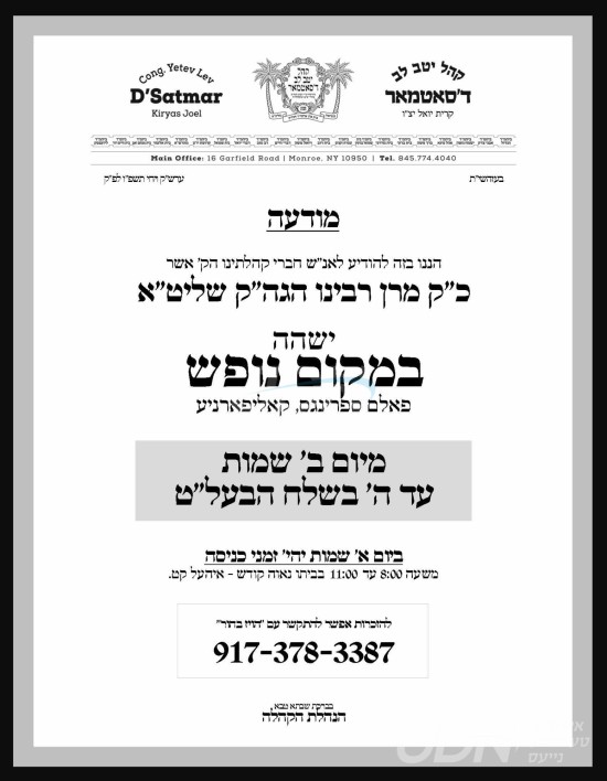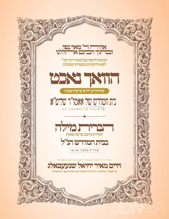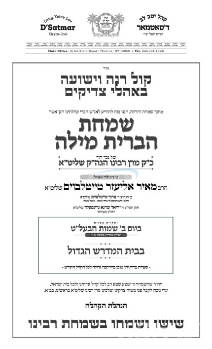 היינט קומט פאר די שמחת הברית פון א אור אייניקל ביי כ"ק אדמו"ר מסאטמאר שליט"א, אייניקל פון זיין איידעם הגה"צ ר' ברוך טייטלבוים שליט"א רב ביהמ"ד ברך משה אין קרית יואל, זון פון הגה"צ גאב"ד וואלאווע שליט"א, בן הנולד ביי זיין זון הרב מאיר אליעזר טייטלבוים שליט"א, איידעם ביי הגה"צ ר' יחיאל שרגא גרינפעלד שליט"א ראה"כ סעמיהאי, זון פון הגה"צ אבד"ק סעמיהאי שליט"א, און איידעם ביי כ"ק אדמו"ר מראצפערט שליט"א. – די שמחה קומט פאר אין ביהמ"ד הגדול אין קרית יואל.