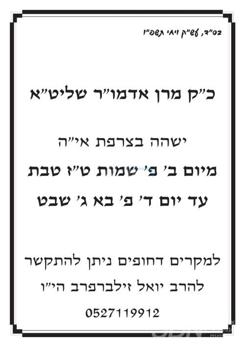 כ"ק אדמו"ר מקוידינוב שליט"א לאזט זיך היינט ארויס אויפן וועג קיין פראנקרייך, וואו דער רבי וועט זיך אויפהאלטן די קומענדיגע צוויי וואכן לטובת מוסדותיו הקדושים.