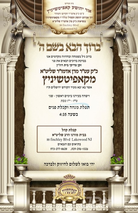 כ"ק אדמו"ר מקאפיטשניץ שליט"א וועלכער איז צוגאסט די טעג אין ניו יארק לרגל די שמחת החתונה פון א אייניקל, וועט היינט מאנטאג אויפנעמען דעם ציבור חסידים אין לעיקוואד, אין שטוב פון זיין זון הגה"צ אב"ד קאפיטשניץ לעיקוואד שליט"א.