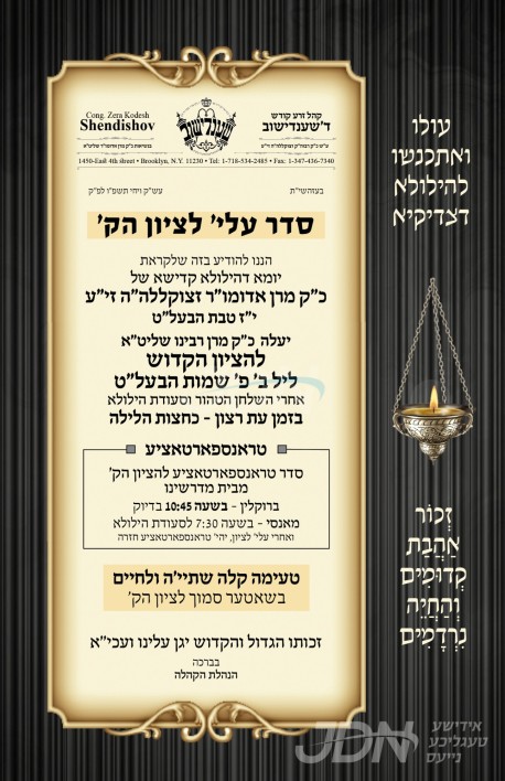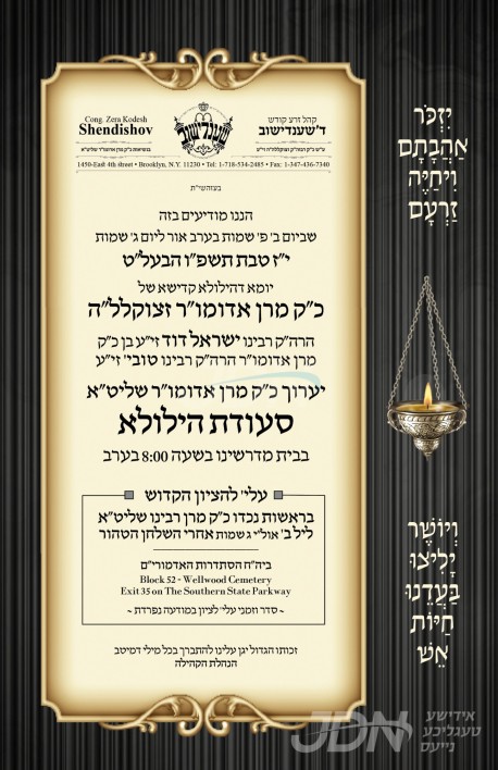 היינט נאכט י"ז טבת געפאלט די יומא דהילולא קדישא פון כ"ק אדמו"ר רבי ישראל דוד משאץ שענדישוב זצ"ל, נכדו כ"ק אדמו"ר משענדישוב שליט"א וועט אפרעכטן די יארצייט טיש היינט אויפדערנאכט בבית מדרשו אין פלעטבוש, און דערנאך ארויפגיין צום ציון הק' אויפן בית החיים הסתדרות האדמורי"ם אין לאנג איילענד.