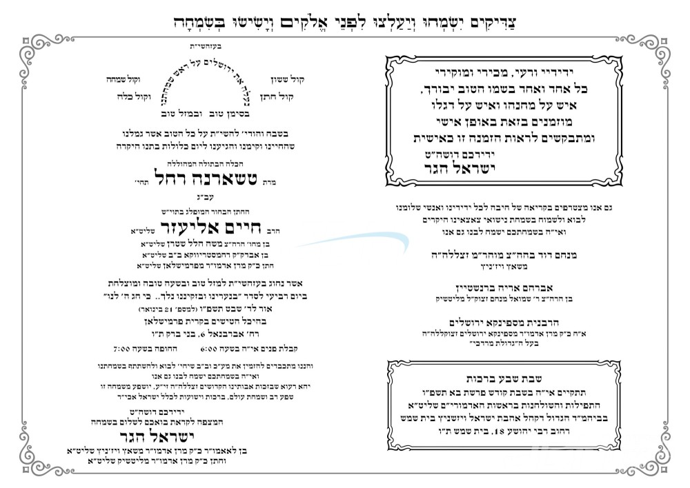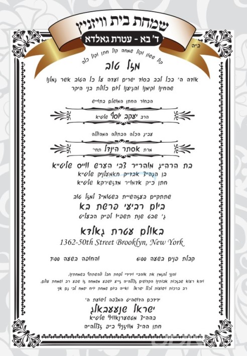 היינט קומט פאר די שמחת החתונה פונעם חתן א זון פון הגה"צ ר' ישראל שנעעבאלג שליט"א אבד"ק טשערנאוויץ בארא פארק, זון פון כ"ק אדמו"ר מטשערנאוויץ שליט"א, און איידעם ביי הגה"צ בעל אור שלום מוויזניץ זצ"ל, מיט די כלה א טאכטער פון הרב הערשל ווייס שליט"א, זון פון הגה"צ ר' חיים אלעזר ווייס שליט"א אבד"ק חאמעלניק ליזענסק, און איידעם ביי כ"ק אדמו"ר מדזירקא שליט"א. – די שמחת החתונה קומט פאר אין זאל עטרת גאלדא אין בארא פארק.