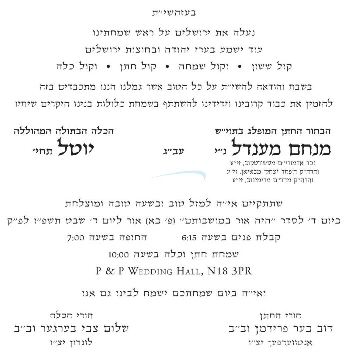 היינט קומט פאר די שמחת החתונה פונעם חתן א זון פון הגה"צ ר' דוב בער פריעדמאן שליט"א אבד"ק טשארטקוב אנטווערפן, מיט די כלה א טאכטער פון הנגיד החסיד ר' שלום צבי בערגער הי"ו פון לאנדאן, זון פון הנגיד החסיד ר' יחזקאל בערגער הי"ו ראה"ק פשעווארסק לאנדאן. – די שמחת החתונה קומט פאר אין זאל P&P אין לאנדאן.