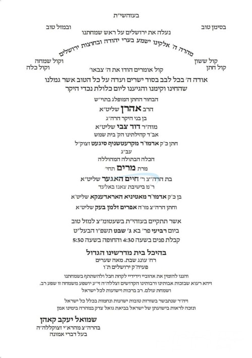 היינט קומט פאר די שמחת החתונה פונעם חתן א זון פון הרב פישל ציגעלהיים שליט"א, איידעם ביי הגה"צ אבד"ק אמרי יצחק שליט"א, מיט די כלה א טאכטער פון הגה"צ ר' ישראל שלום יוסף טווערסקי שליט"א אב"ד טריסק מאנסי, זון פון כ"ק אדמו"ר מטריסק לאנדאן שליט"א, און איידעם ביי הגה"צ אבד"ק ראדאמישלא מאנסי שליט"א. – די שמחת החתונה קומט פאר אין מאנסי.