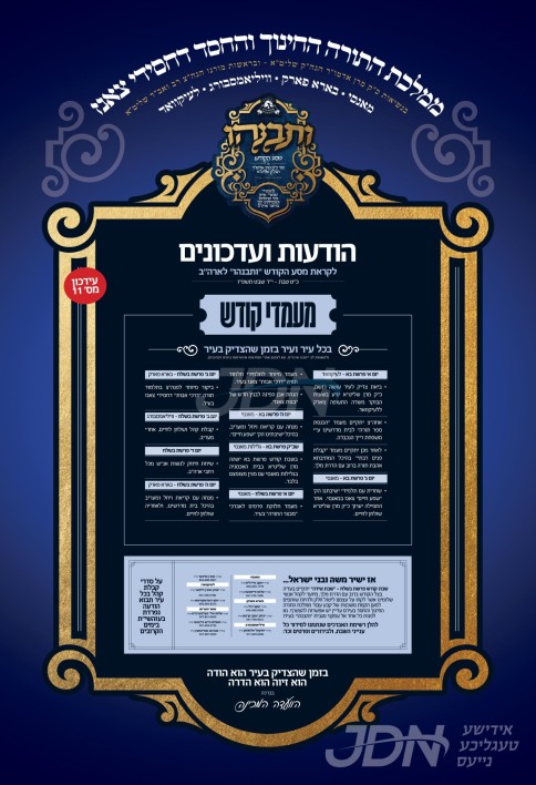 שמחת בית זוועהיל – טרעבישאן – פינסק קארלין: דעם שבת קומט פאר די שמחת האויפרוף פונעם חתן א זון פון כ"ק אדמו"ר מזוועהיל שליט"א, אייניקל פון כ"ק אדמו"ר מראחמיסטריווקא זצ"ל, מיט די כלה א טאכטער פון כ"ק אדמו"ר מטרעבישאן שליט"א, איידעם ביי כ"ק אדמו"ר מפינסק קארלין שליט"א. – די שמחת האויפרוף קומט פאר אין די פריימאן זאל אין ביתר.