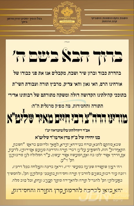 עס איז געשלאסן געווארן די שידוך פונעם חתן א זון פון הגה"צ ר' אליעזר שמעון הורוויץ שליט"א אבד"ק דזיקוב ב"פ, איידעם ביי הגה"צ אבד"ק באבוב 45 שליט"א, מיט די כלה א טאכטער פון הגה"צ ר' יהושע האלבערשטאם שליט"א, זון פון כ"ק אדמו"ר מצאנז וומס"ב שליט"א, און איידעם ביי הגה"צ ר' יוסף משה מייזליש שליט"א אבד"ק לאסק.
