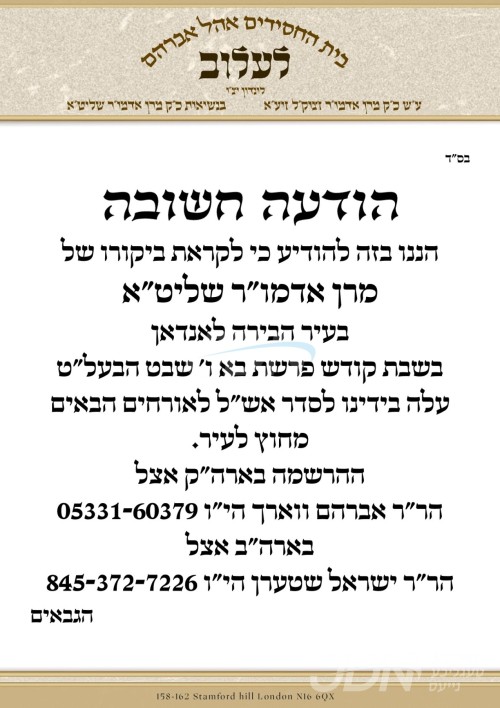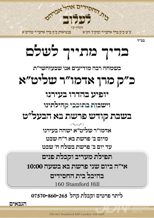 כ"ק אדמו"ר מלעלוב שליט"א פון ירושלים איז צוגאסט אויף דעם שבת אין לאנדאן בקרב חסידיו, די תפילות און טישן קומען פאר בבית מדרשו אויף סטעמפארד הילל.