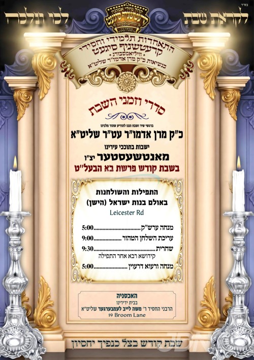 כ"ק אדמו"ר מקרעטשניף סיגעט וומס"ב שליט"א איז צוגאסט אויף דעם שבת אין מאנטשעסטער בקרב חסידיו, די תפילות און טישן קומען פאר אין זאל בנות ישראל, די אכסניא איז אין שטוב פון הרב החסיד ר' משה לייב לעמבערגער הי"ו.