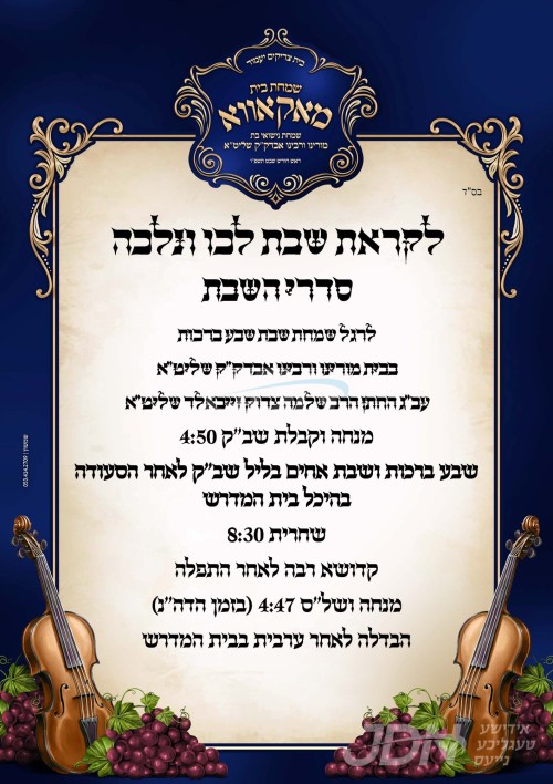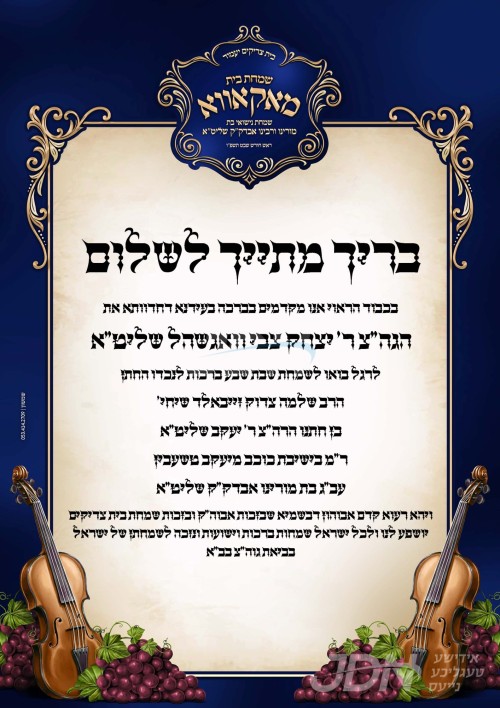 דעם שבת קומט פאר די שמחת האויפרוף פונעם חתן א זון פון הגה"צ ר' ישראל צבי לעמבערגער שליט"א, זון פון הגה"צ אבד"ק מאקאווא אשדוד שליט"א, און איידעם ביי הגה"צ אבד"ק סערט וויזניץ ירושלים זצ"ל, מיט די כלה א טאכטער פון הגה"צ ר' מאיר יהוסף ראטטענבערג שליט"א, זון פון כ"ק אדמו"ר מקאסאן לאנדאן שליט"א, און איידעם ביי כ"ק אדמו"ר מסטראזניץ לאנדאן שליט"א. – די שמחת האויפרוף קומט פאר אין ביהמ"ד מאקאווא אין אשדוד.