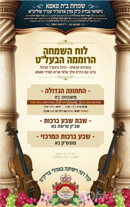 שמחת בית פאפא: דעם שבת קומט פאר די שמחת השבע ברכות פון א אייניקל ביי כ"ק אדמו"ר מפאפא שליט"א, די כלה א טאכטער פון זיין איידעם הגה"צ ר' מאיר יחיאל מיכל דייטש שליט"א אבד"ק מעייני הישועה מאנסי, זון פון הגה"צ ר' יחזקאל דייטש שליט"א אבד"ק מקור חיים, מיט די חתן א זון פון הגה"צ ר' משה מנחם זעגעלבוים שליט"א אבד"ק אלכסנדר וומס"ב, זון פון הגה"צ ר' ליפא זעגעלבוים שליט"א מוויען, און איידעם ביי הגה"צ ר' סיני האלבערשטאם שליט"א אדמו"ר מצאנז וומס"ב, איידעם ביי הגה"צ אבד"ק שימלויא שליט"א. – די שמחת השבע ברכות קומט פאר אין ביהמ"ד הגדול פאפא אין וויליאמסבורג.