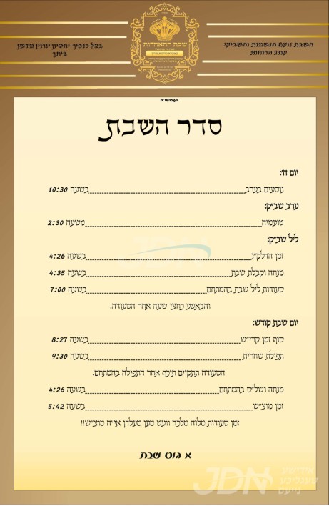 דעם שבת קומט פאר די שמחת האויפרוף פונעם חתן א זון פון כ"ק אדמו"ר מזידטשויב מארין פארק שליט"א, זון פון כ"ק אדמו"ר מזידטשויב שיקאגא זצ"ל, און איידעם ביי הגה"צ אבד"ק פרעמישלאן פלעטבוש זצ"ל, מיט די כלה א טאכטער פון כ"ק אדמו"ר מקאלאמייא שליט"א, זון פון כ"ק אדמו"ר מסאסרעגען זצ"ל, און איידעם ביי כ"ק אדמו"ר מצאנז זצ"ל פון בארא פארק. – די שמחת האויפרוף קומט פאר אין ביהמ"ד זידטשויב אין מארין פארק.