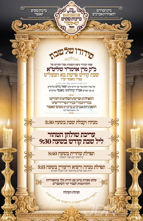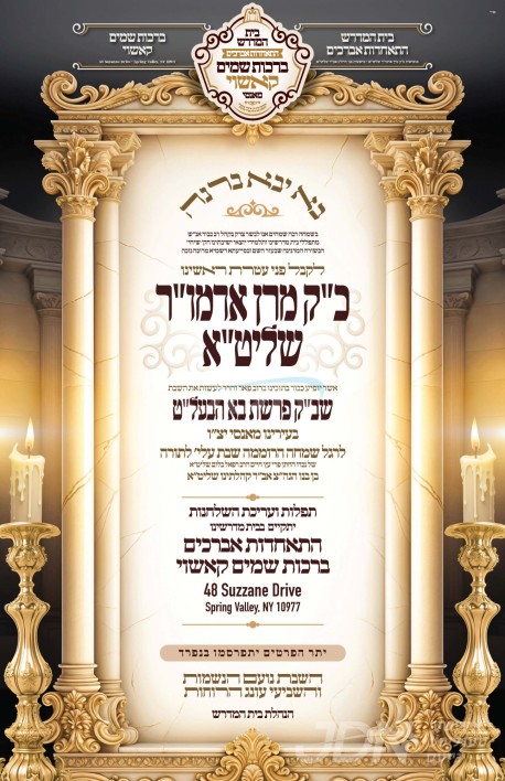 שמחת בית קאשוי: דעם שבת קומט פאר די שמחת האויפרוף פון א אייניקל ביי כ"ק אדמו"ר מקאשוי שליט"א, די חתן א זון פון זיין זון הגה"צ ר' יואל בלום שליט"א אב"ד ברכת שמים קאשוי מאנסי, איידעם ביי הגה"צ ר' יהודה כ"ץ שליט"א אבד"ק ויצב אברהם מעלבארן, מיט די כלה א טאכטער פון הגה"צ ר' אשר מאנן שליט"א דומ"ץ סאטמאר מוירטל. – די שמחת האויפרוף קומט פאר אין ביהמ"ד ברכת שמים קאשוי אין מאנסי. – דער זיידע כ"ק אדמו"ר מקאשוי שליט"א איז צוגאסט אויף שבת אין מאנסי לכבוד די שמחה, און וועט פראווענען די תפילות און טישן בבית מדרשו התאחדות אברכים ברכת שמים קאשוי.