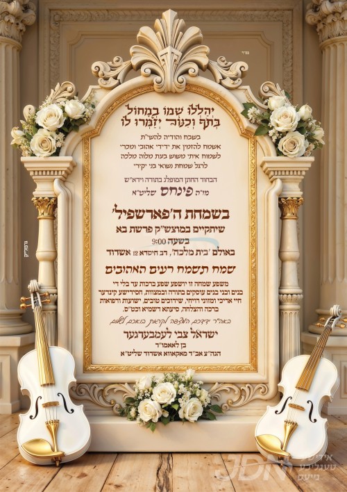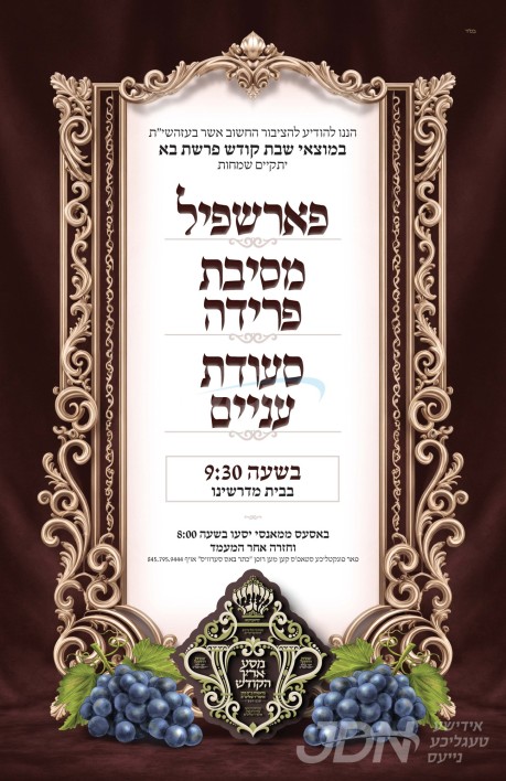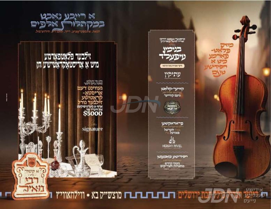 היינט קומט פאר די שמחת הפארשפיל פונעם חתן א זון פון הגה"צ ר' ישראל צבי לעמבערגער שליט"א, זון פון הגה"צ אבד"ק מאקאווא אשדוד שליט"א, און איידעם ביי הגה"צ אבד"ק סערט וויזניץ ירושלים זצ"ל, מיט די כלה א טאכטער פון הגה"צ ר' מאיר יהוסף ראטטענבערג שליט"א, זון פון כ"ק אדמו"ר מקאסאן לאנדאן שליט"א, און איידעם ביי כ"ק אדמו"ר מסטראזניץ לאנדאן שליט"א. – די שמחת הפארשפיל קומט פאר אין זאל בית מלכה אין אשדוד.